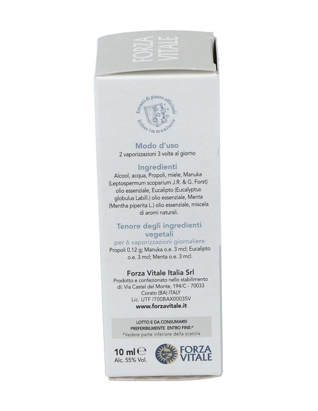 Alcohol, Agua, Propóleos (Propolis), miel, aceites esenciales de: Manuka (Leptospermum scoparium), Eucalipto (Eucalyptus globulus), Menta (Mentha piperita): mezcla de aromas naturales.