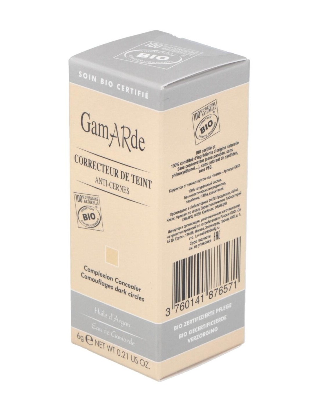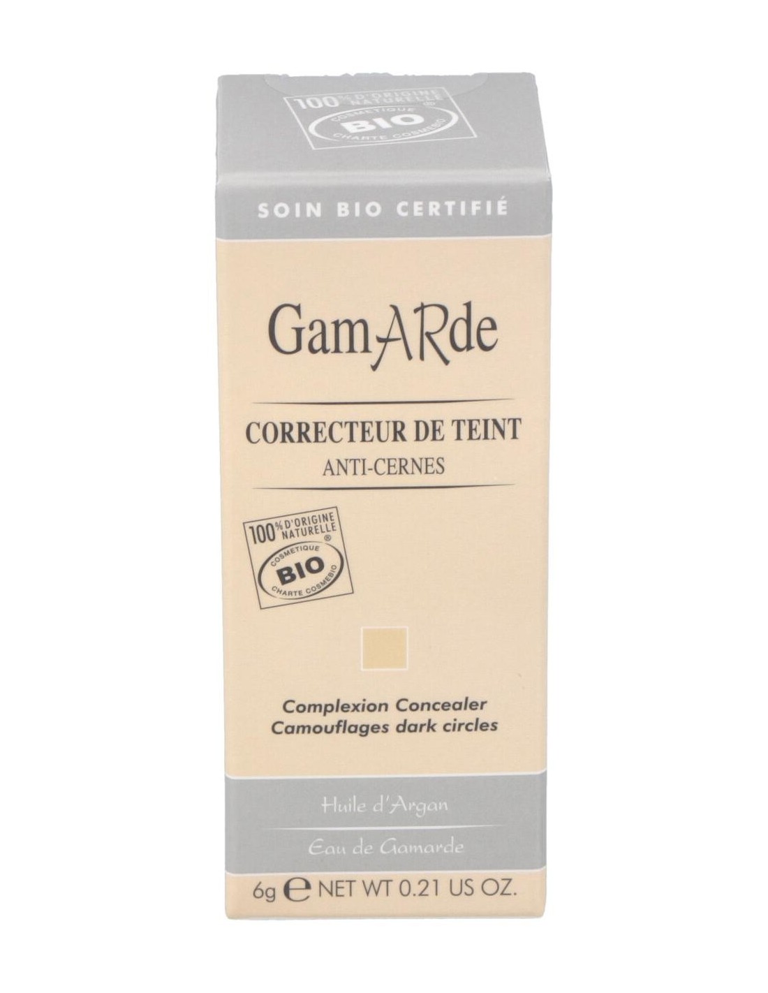 Agua de Gamarde, Aceite de Argán*, Dióxido de titanio, Óxido de Hierro rojo, Óxido de Hierro amarillo (colorantes de origen mineral), Hidrolato de Eucalipto*, Extracto de Bambú, Tintura de Castaño de Indias*, Aceites esenciales de Palmarosa*, Lavanda* e Ylang Ylang*.
