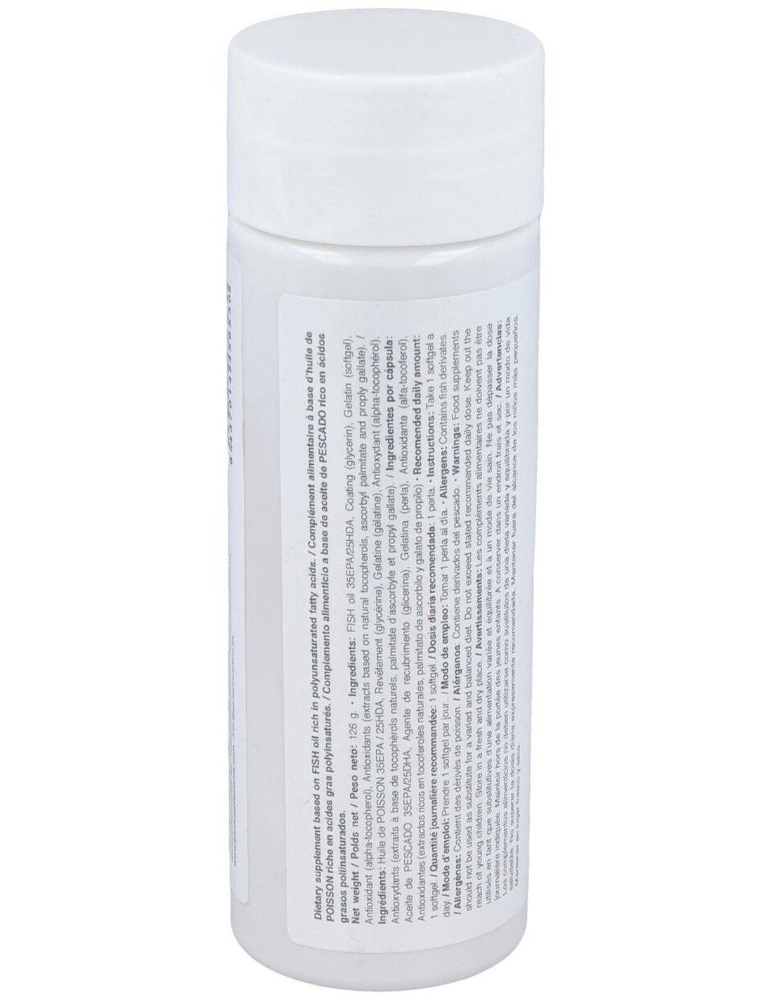 Aceite de pescado 35 EPA/25 DHA, gelatina (perla), glicerina, alfa-tocoferol, antioxidantes (extractos ricos en tocoferoles naturales, palmitato de ascorbilo, gelato de propilo)