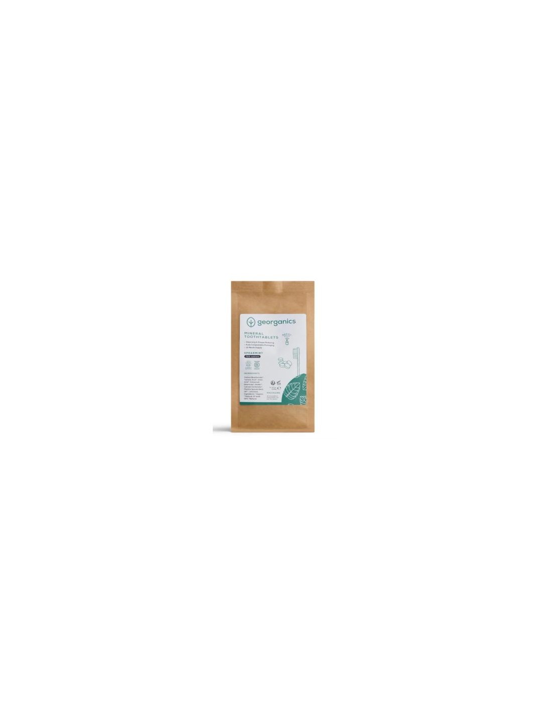 GEORGANICSUna forma limpia de cepillarse los dientes, estas tabletas dentales minerales están hechas con polvos ricos en minerales como el carbonato de calcio y la arcilla de caolín. Utilizadas a diario como reemplazo de la pasta de dientes tradicional, estas tabletas limpiadoras y reductoras de placa evitan enviar aproximadamente 8 tubos de plástico al vertedero en un año. Saborizado con aceite de menta verde orgánico por su delicado aroma a menta y propiedades antisépticas. Sin flúor, SLS ni glicerina. Producto vegano.