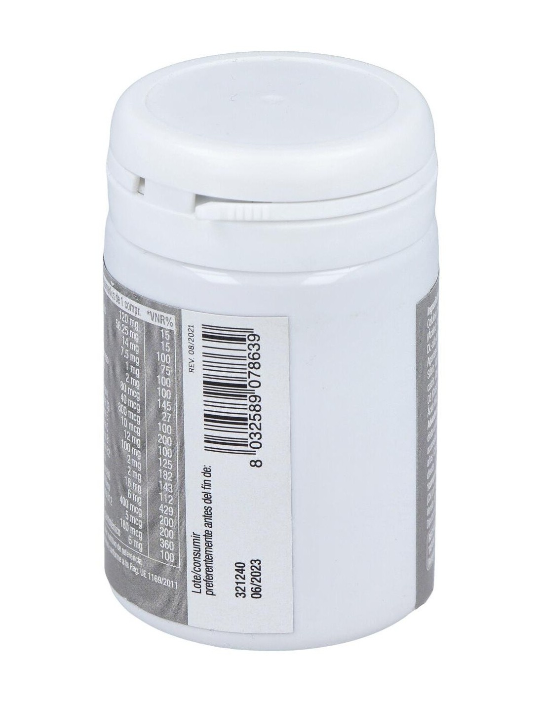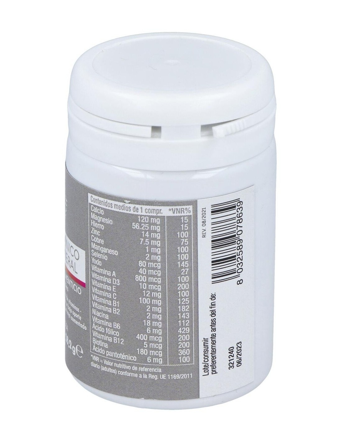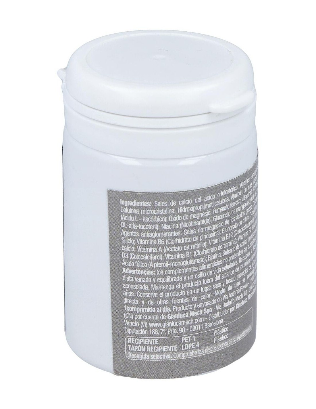 Sales de calcio del ácido ortofosfórico: Oxxynea® (Olea europaea L. hojas y frutos, Vitis vinifera L. hojas, frutos y semillas, Punica granatum L. frutas, Camellia sinensis (L.) hojas de Kuntze, Citrus paradisi Pericarpio de Macfad, Vaccinum myrtillus L. frutas, Citrus sinensis (L.) Osbeck pericarpo) e.s. tit 51% de polifenoles expresados como ácido gálico: agente de carga: hidroxipropilcelulosa: vitamina C (ácido ácido L ascórbico): Bisglicinato de hierro: Óxido de magnesio: Betacaroteno (contiene soja): Vitamina E (acetato de D-alfa-tocoferilo): caléndula erecta L. capolini e.s. tit 10% de luteína: Haematococcus pluvialis Flotow tallo e.s. tit 5% astaxantina: Niacina (nicotinamida): Gluconato de manganeso: Antiaglomerante: mono y diglicéridos. de ácidos grasos: Óxido de zinc: Vitamina B6 (clorhidrato de piridoxina): Gluconato de cobre: Pantotenato de calcio: Vitamina B12 (cianocobalamina): Vitamina D3 (colecalciferol): Vitamina B1 (clorhidrato de tiamina): Vitamina B2 (riboflavina): Ácido fólico (ácido monoglutámico pteroil): biotina: Selenito de sodio: Yoduro de potasio.