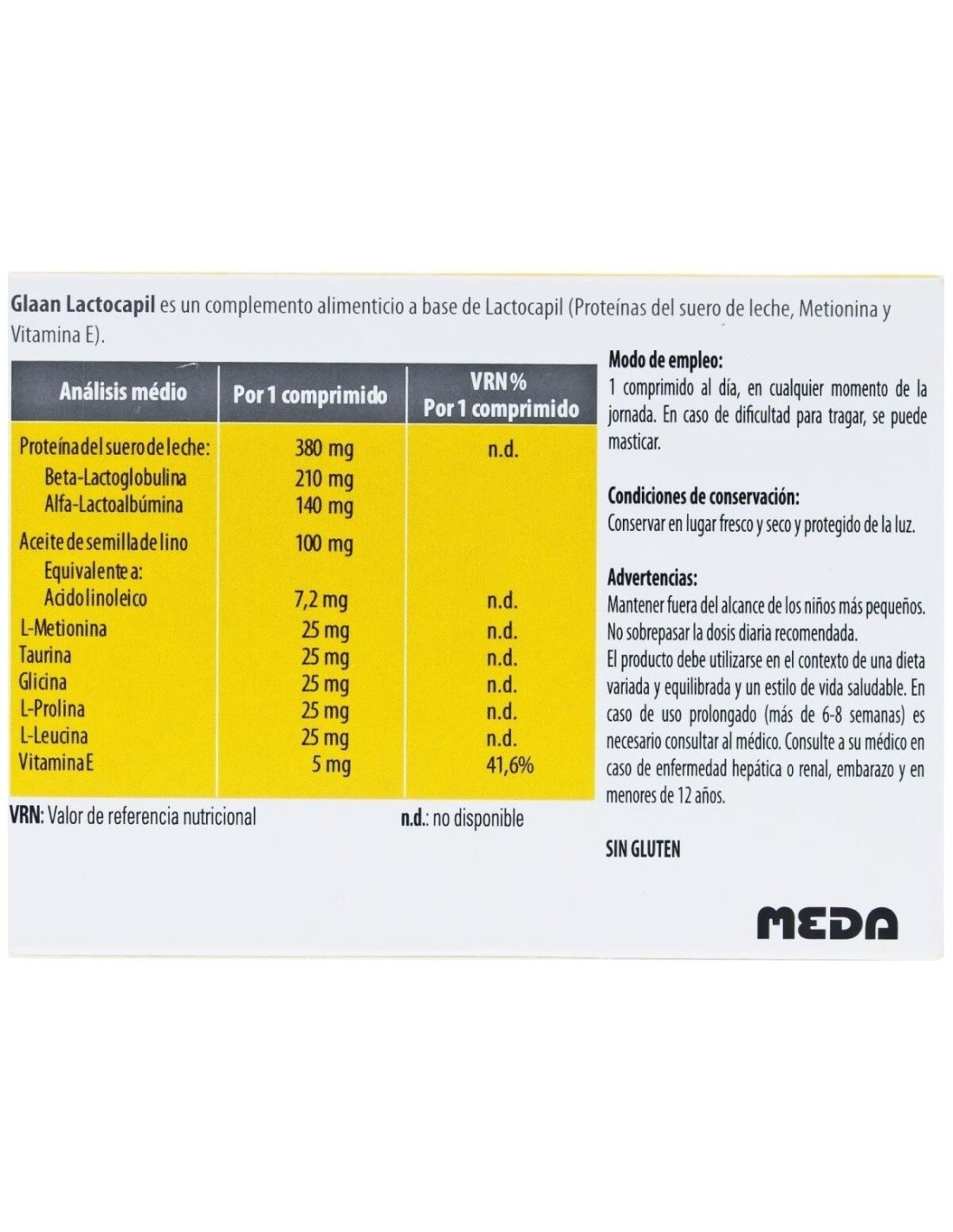 Glaan Lactocapil 30comp es uncomplemento alimenticio para la caída del cabello que ayuda a reforzar la estructura del cabello y además contribuye a prolongar la fase de crecimiento activo retrasando su caída.