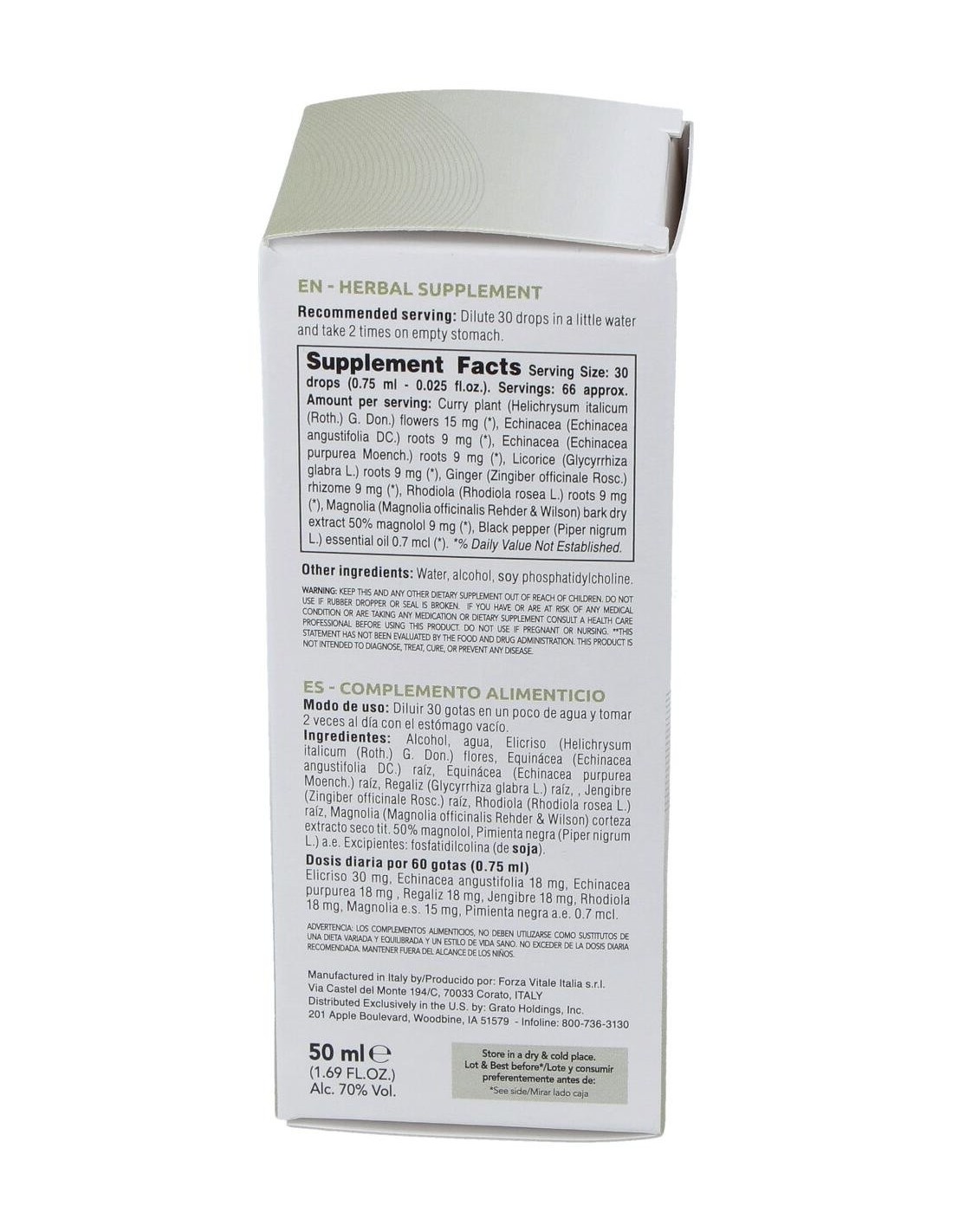 Alcohol, agua, Helicriso (Helichrysum italicum (Roth.) G. Don.) flores, Equinácea (Echinacea angustifolia DC.) raíz, Equinácea (Echinacea purpurea Moench. 50%) raíz, Regaliz (Glycyrrhiza glabra L.) raíz, Jengibre (Zingiber officinale Rosc.) rizoma, Rodiola (Rhodiola rosea L.) raíz, Magnolia (Magnolia officinalis Rehder & Wilson) extracto seco de corteza tit. 50% magnolol, Pimienta Negra (Piper nigrum L.) a.e. Excipientes: fosfatidilcolina (de soja).