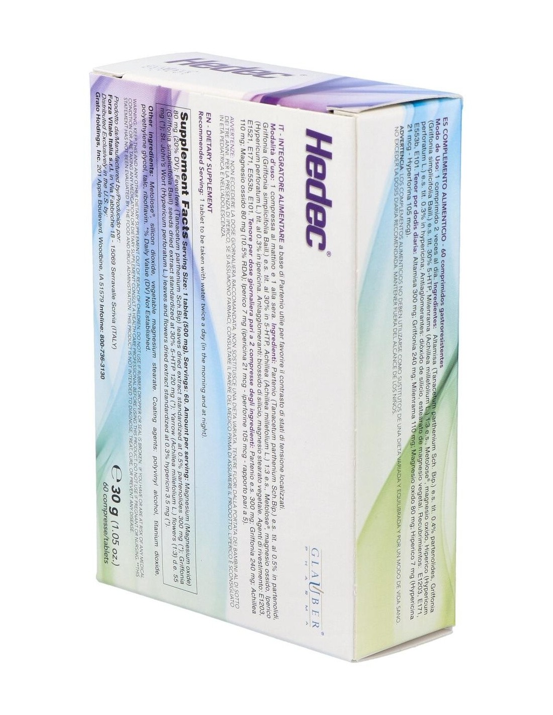 Altamisa (Tanacetum partenium) e.s. tit. 0,5% partenolides, Griffonia (Griffonia simplicifolia) e.s. tit. 30% 5-HTP, Milenrama (Achillea millefolium)(1:3) e.s., Metolose®, magnesio oxido, Hipérico (Hypericum perforatum) e.s. tit. 0,3% in hypericina: Antiaglomerantes: diòxido de silicio, estearato de magnesio vegetal. Recubrimientos: almidòn acetilado (E1420), talco, glicerol, colorantes (E132)