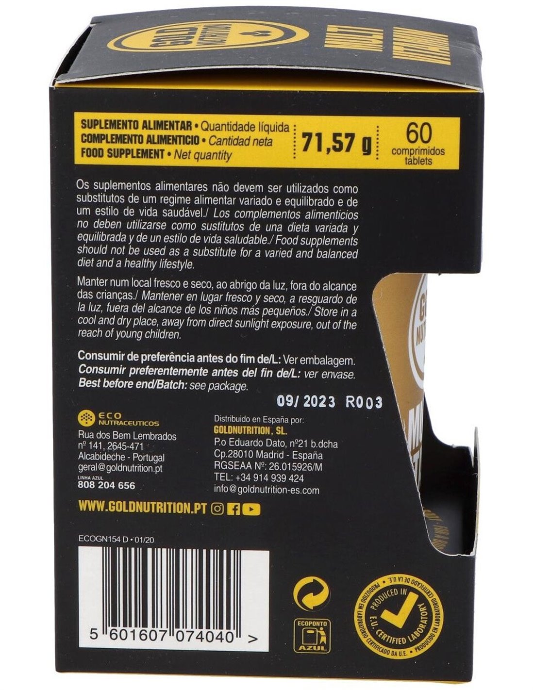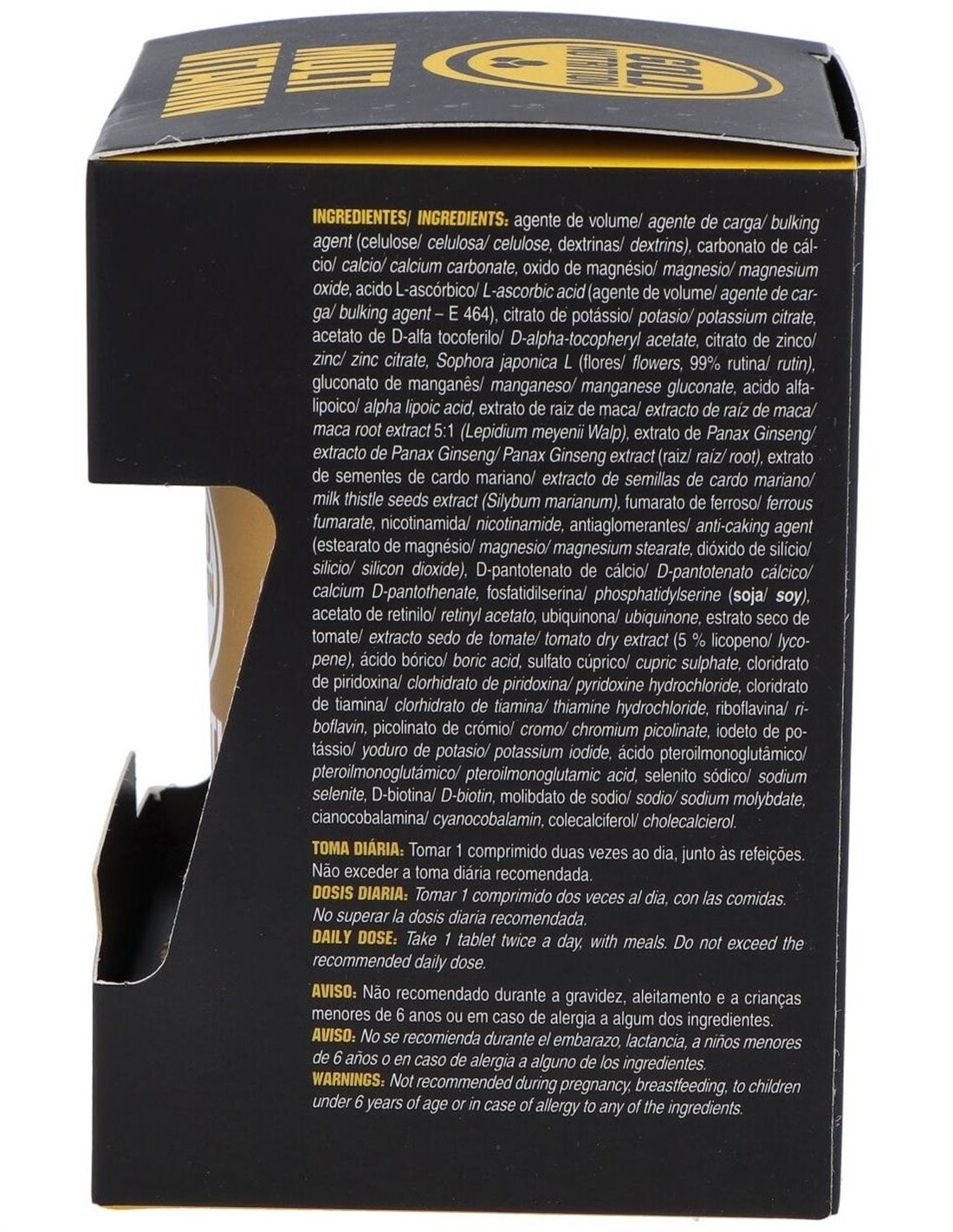Agente De Carga (Celulosa Microcristalina), Citrato De Calcio, Óxido De Magnesio, Citrato De Potasio, Gluconato De Ferroso, Ácido L-Ascórbico, Citrato De Zinc, Extracto De Raíz De Maca 4:1 (Lepidium Meyenii), Extracto De Raíz De Panax Ginseng, Extracto De Cardo Mariano (Silybum Marianum, Semillas), Licopeno, Ácido Alfa-Lipoico, Rutina, Levadura Enriquecida Con Selenio, Acetato De D-Alfa Tocoferilo, Antiaglomerantes (Estearato De Magnesio, Dióxido De Silicio), Fosfatidilserina (Soja), Citrato De Manganeso, Nicotinamida, D-Pantotenato Cálcico, Ubiquinona, Sulfato Cúprico, Borato Sódico, Clorhidrato De Piridoxina, Clorhidrato De Tiamina, Riboflavina, Acetato De Retinilo, Picolinato De Cromo, Ácido Pteroilmonoglutámico, Yoduro De Potasio, D-Biotina, Molibdato De Sodio, Cianocobalamina, Colecalciferol.
