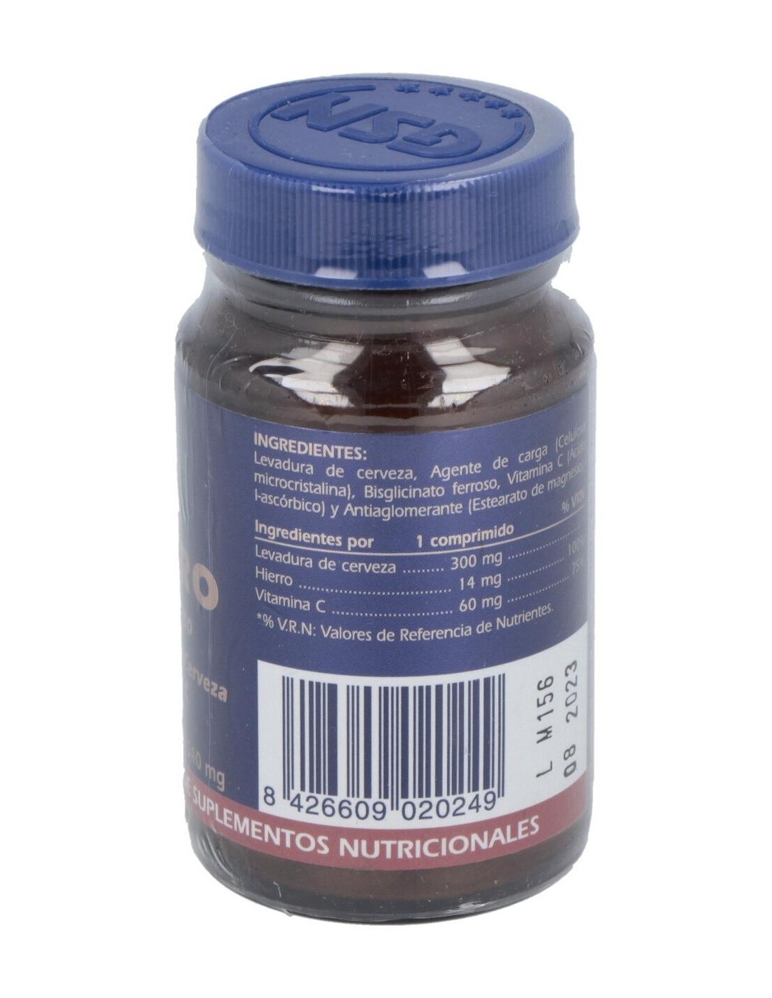 Hierro, bisglicinato 78 mg aporta 14 mg de hierro, Vitamina C 60 mg, Levadura de cerveza 300 m.