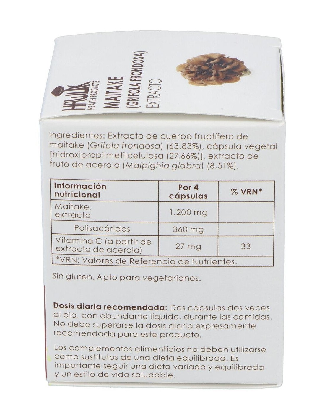 Complemento alimenticio a base de extracto de hongo maitake con alto contenido en polisacáridos, con extracto de acerola rico en vitamina C. Actúa sobre la glucosa y la insulina, la presión arterial, el peso y los lípidos sanguíneos. Es inmunomodulador y está indicado en caso de enfermedades hepáticas y osteoporosis. Apto para vegetarianos y veganos.