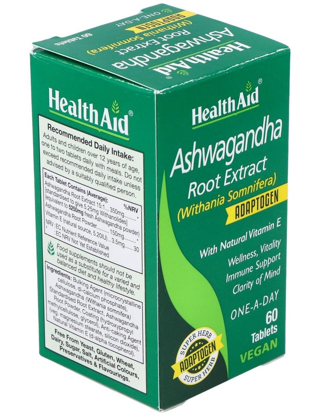 Contiene extracto y polvo de raíz de ashwagandha, aportando 5,25 mg de withanólidos por comprimido, y vitamina E natural por su aporte antioxidante, beneficioso en patologías como estrés, ansiedad y depresión, las cuales generan en el organismo una gran cantidad de radicales libres. Apto para veganos.