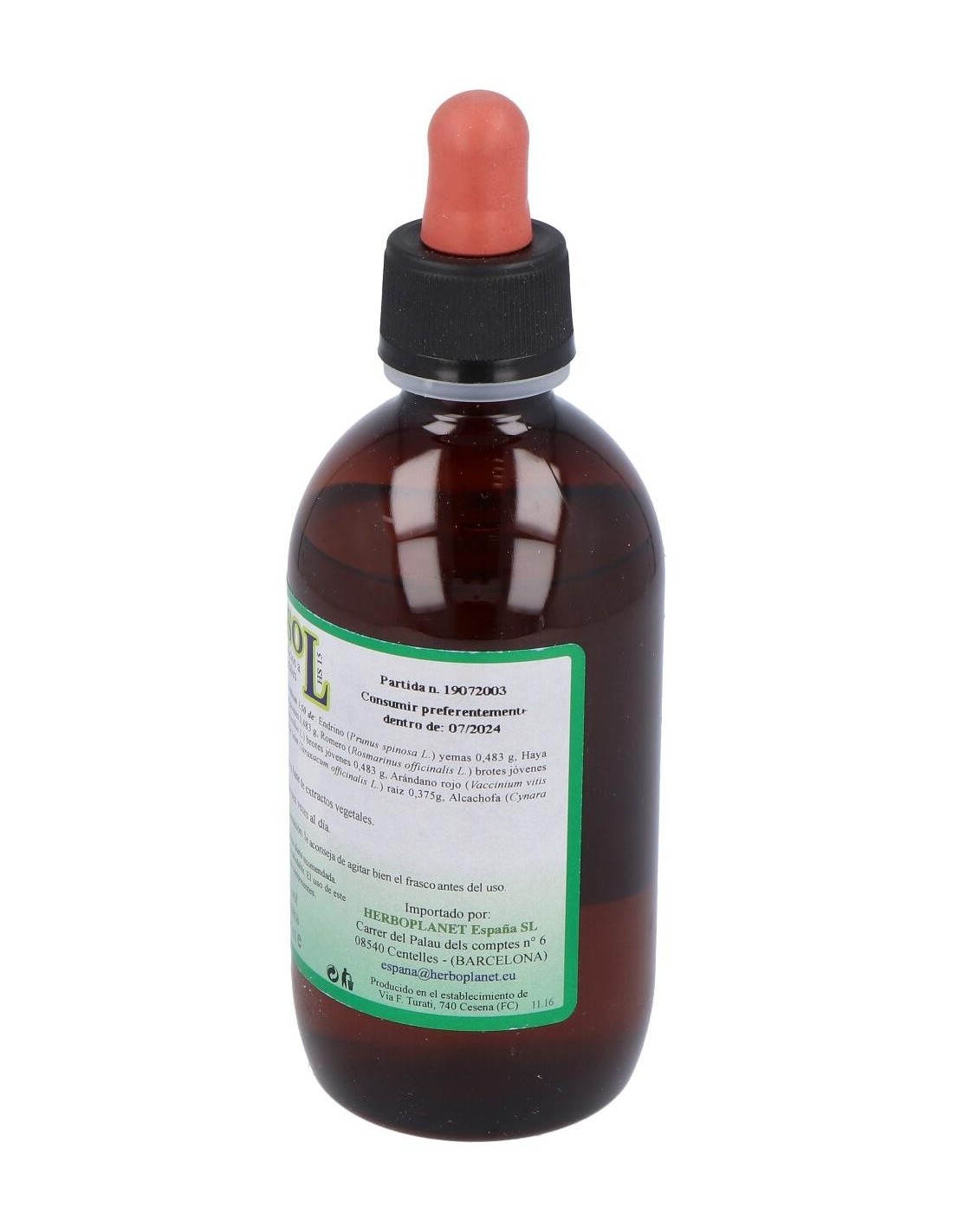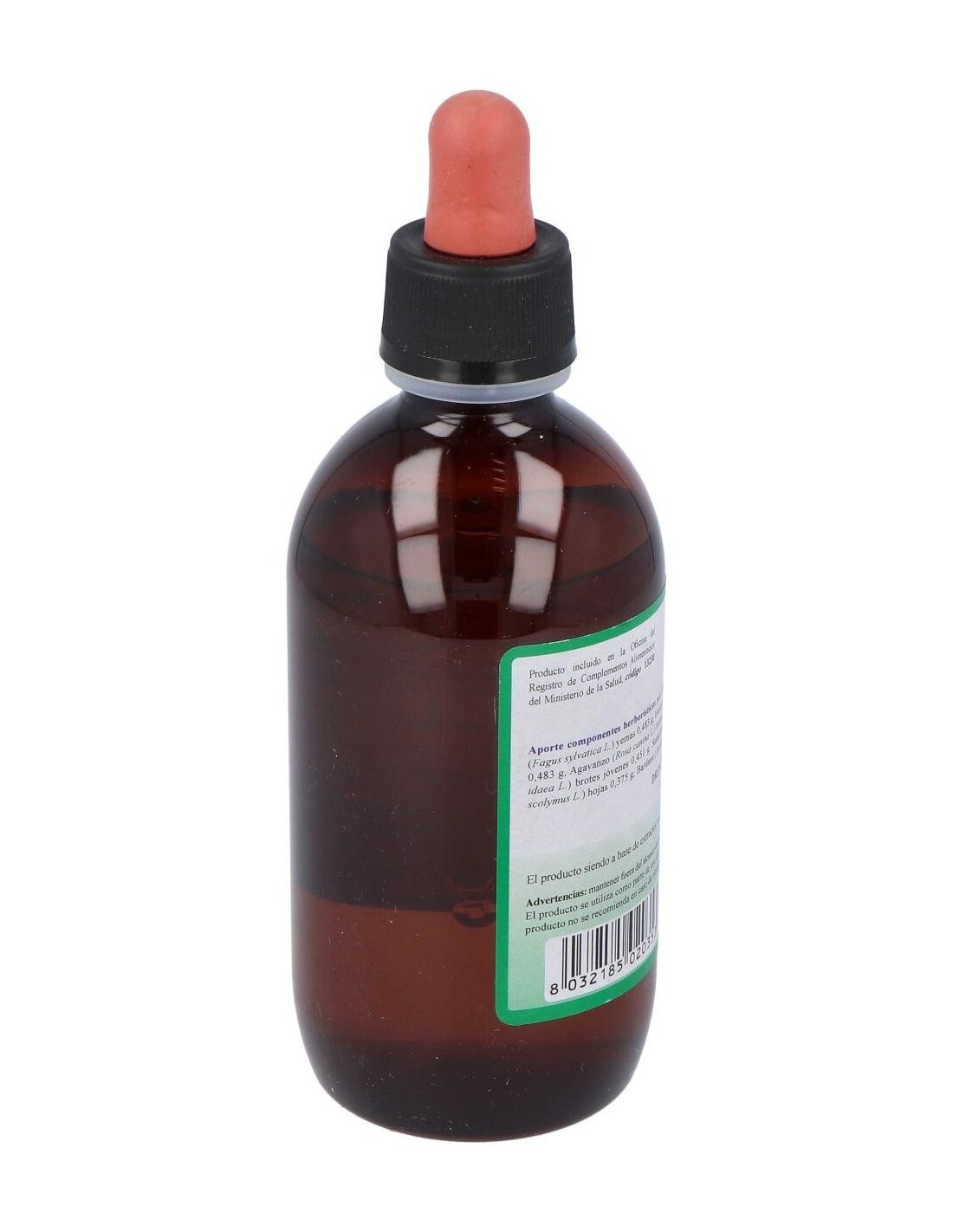MSA (Macerado Espagírico-Alquímico de Solanimus R.E. 1/50) de: Endrino (Prunus spinosa L.) yemas 0,483 g, Haya (Fagus sylvatica L.) yemas 0,483 g, Enebro (Juniperus communis L.) jóvenes brotes 0,483 g, Romero (Rosmarinus officinalis L.) jóvenes brotes 0,483 g, Arándano rojo (Vaccinium vitis idaea L.) jóvenes brotes 0,451 g, Rosal silvestre (Rosa canina L.) jóvenes brotes 0,483 g, Arándano (Vaccinium myrtillus L.) jóvenes brotes 0,483 g. TSA (Tintura Espagírico-Alquímica de Solanimus R.E. 1/10) de: Diente de León (Taraxacum officinale Weber) raíz 0,375 g, Alcachofa (Cynara scolymus L.) hojas 0,375 g, Bardana (Arctium lappa L.) raíz 0,375 g.