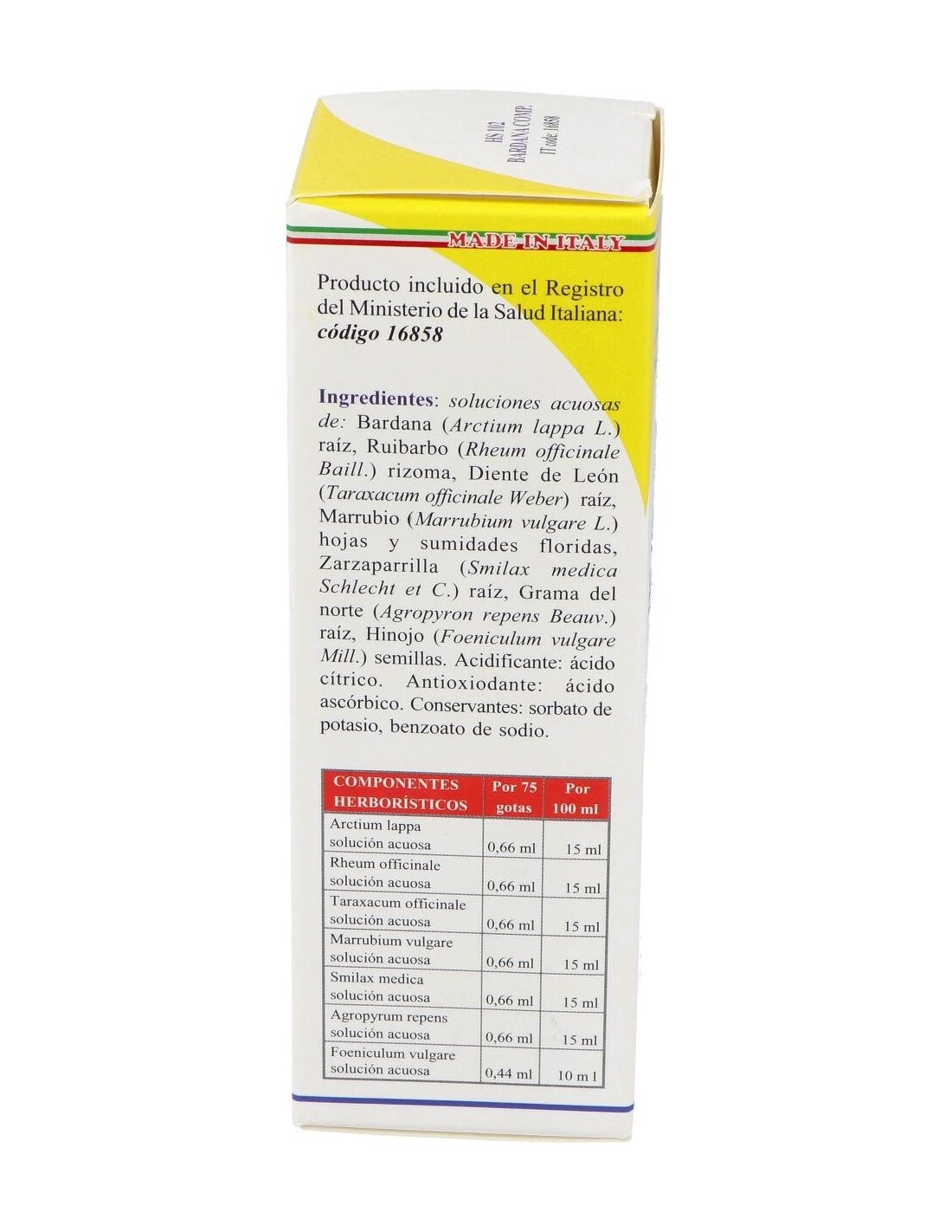 Soluciones acuosas de: Bardana (Arctium lappa L.) raíz 0,66 ml, Ruibarbo (Rheum officinale Baill.) rizoma 0,66 ml, Diente de León (Taraxacum officinale Weber) raíz 0,66 ml, Marrubio (Marrubium vulgare L.) hojas y sumidades floridas 0,66 ml, Zarzaparrilla (Smilax medica Schelecht et C.) raíz 0,66 ml, Grama del norte (Agropyrum repens Beauv.) raíz 0,66 ml, Hinojo (Foeniculum vulgare Mill.) semillas 0,44 ml. Acidificante: ácido cítrico. Antioxiodante: ácido ascórbico. Conservantes: sorbato de potasio, benzoato de sodio.