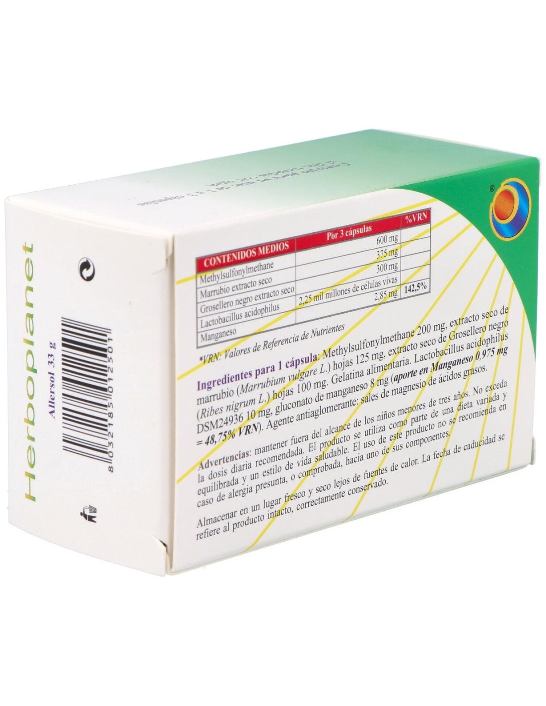 Azufre orgánico (Methylsulfonylmethane) 600 mg, extracto seco de Marrubio (Marrubium vulgare L.) hojas 375 mg, extracto seco de Grosellero Negro (Ribes nigrum L.) hojas 300 mg. Gelatina alimentaria. Lactobacillus acidophilus DSM24936 30 mg, (aporte en células vivas 2250 millones). Gluconato de Manganeso 24 mg (aporte en Manganeso 2,86 mg). Agente antiaglomerante: sales de magnesio de los ácidos grasos.