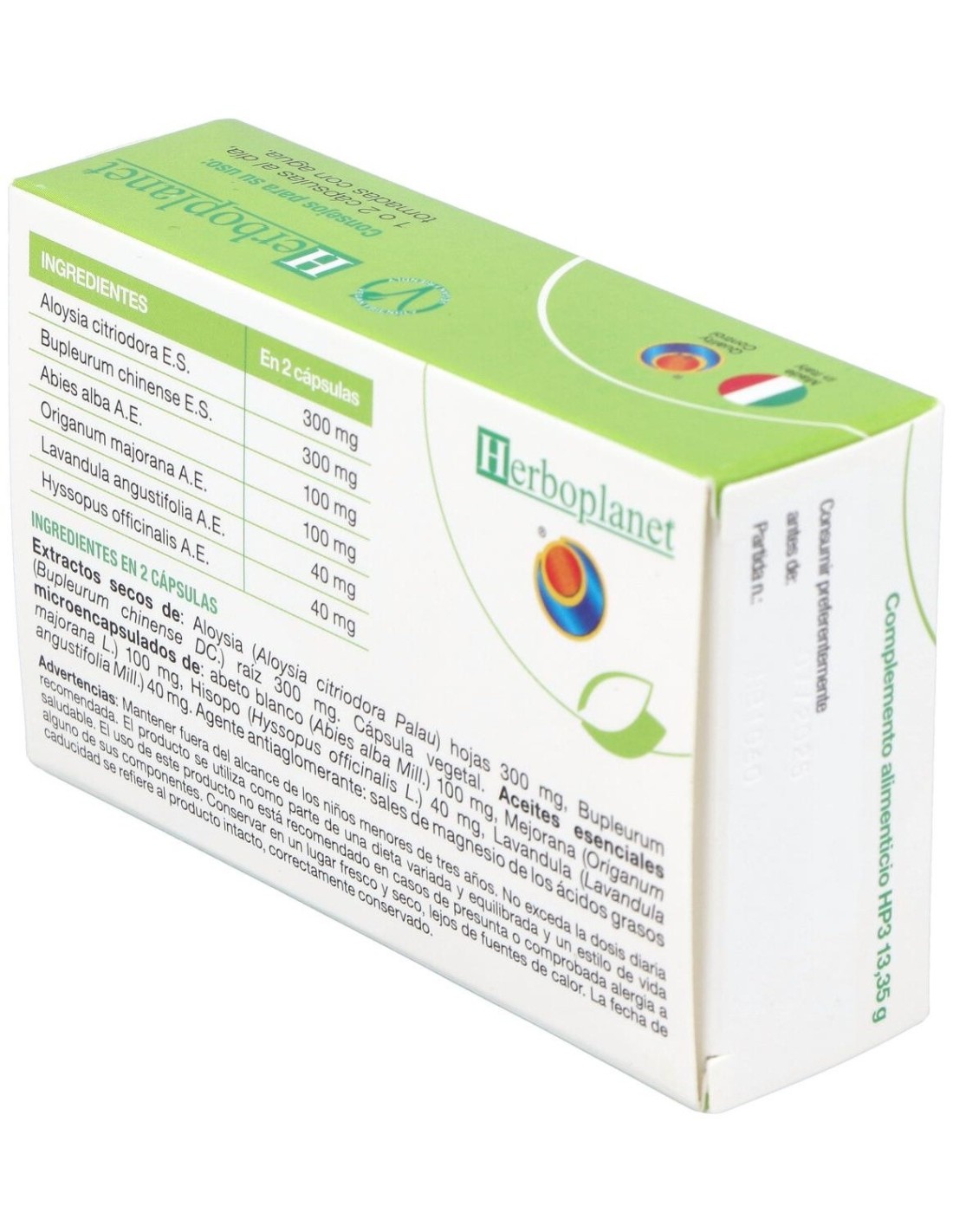 Extractos secos de: Aloysia (Aloysia citriodora Palau) hojas 300 mg, Bupleurum (Bupleurum chinense DC.) raíz 300 mg. Cápsula vegetal. Aceites esenciales microencapsulados de: Abeto blanco (Abies alba Mill.) 100 mg, Mejorana (Origanum majorana L.) 100 mg, Hisopo (Hyssopus officinalis L.) 40 mg, Lavandula (Lavandula angustifolia Mill.) 40 mg. Agente antiaglomerante: sales de magnesio de los ácidos grasos.