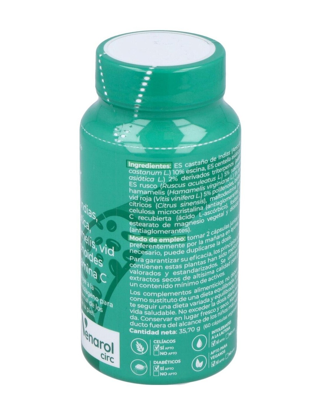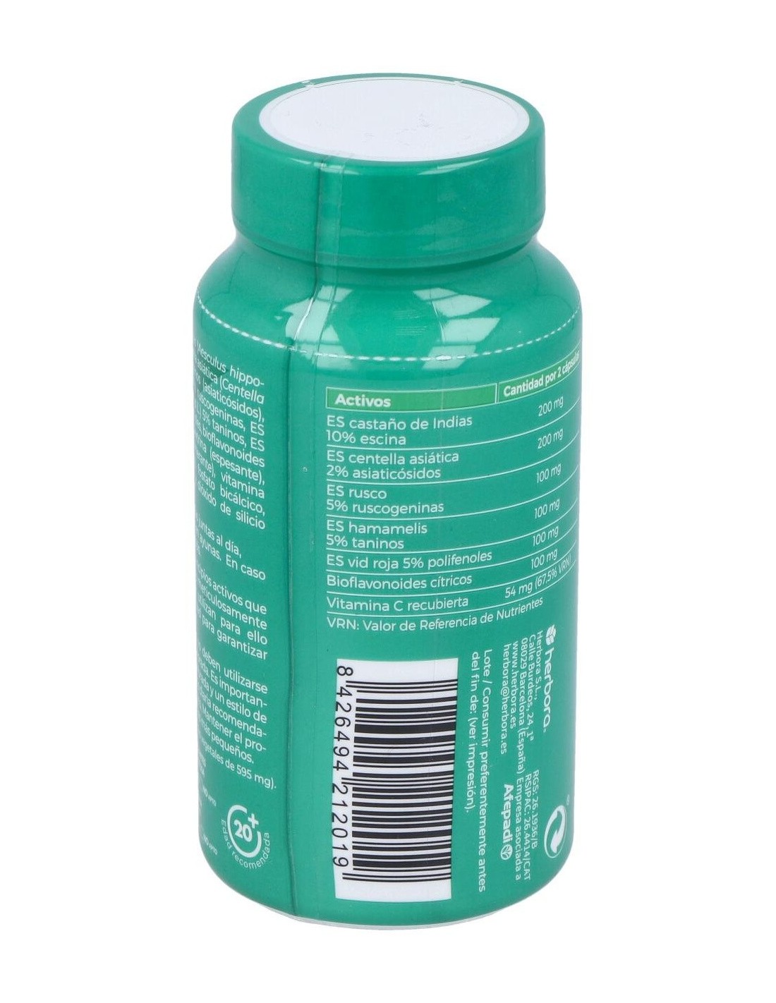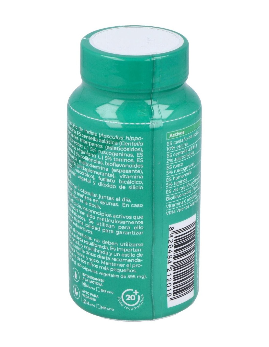 Castaño de Indias (Aesculus hippocastanum L.) 10% escina 200mg, Centella asiática (Centella asiatica L.) 2% asiaticósidos 200mg, Rusco (Ruscus aculeatus L.) 5% Ruscogeninas 100mg, Hamamelis (Hamamelis virginiana L.) 5% Taninos 100mg, Vid roja (Vitis vinifera L.) 5% Polifenoles 100mg, Bioflavonoides cítricos 100mg, Vitamina C recubierta 54mg, Otros ingredientes: maltodextrina (espesante), celulosa microcristalina (antiaglomerante), fosfato bicálcico, estearato de magnesio vegetal y dióxido de silicio (antiaglomerantes).