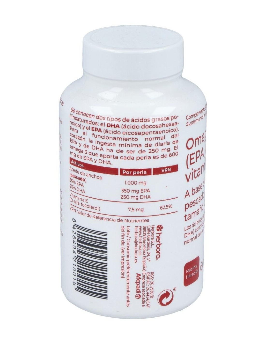 Aceite de anchoa (pescado) 1.000 mg, 35% EPA 350 mg EPA, 25% DHA 250 mg DHA, Vitamina E (D-alfa-tocoferol) 7,5 mg (62,5% VRN).