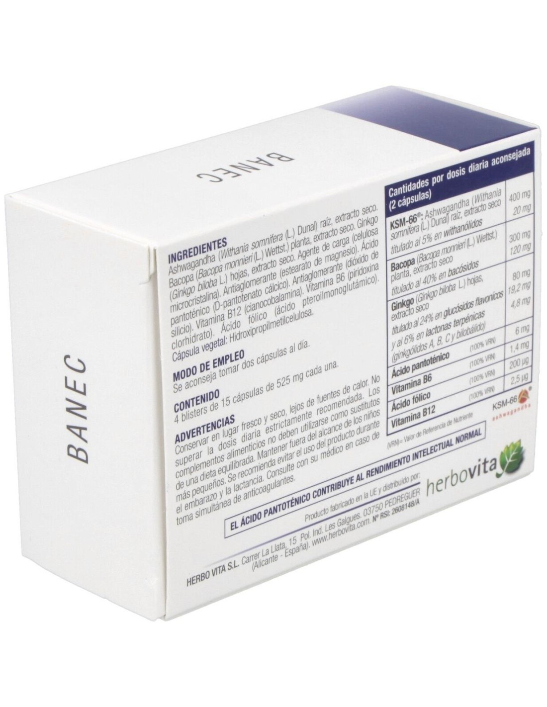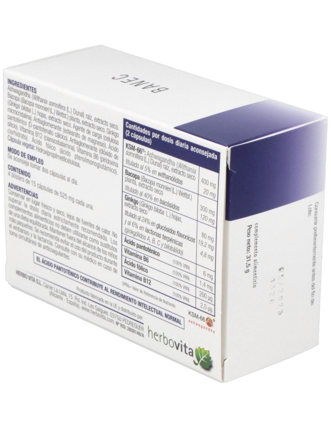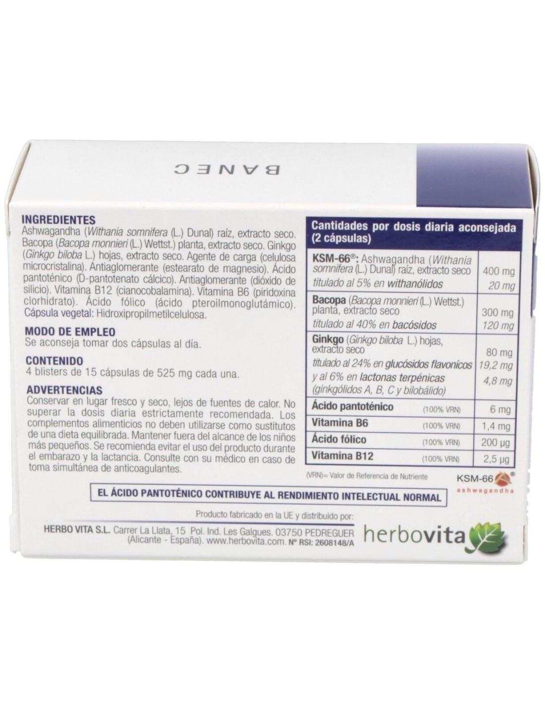 Ashwagandha (Withania somnifera (L.) Dunal) raíz, extracto seco. Bacopa (Bacopa monnieri (L.) Wettst.) planta, extracto seco. Ginkgo (Ginkgo biloba L.) hojas, extracto seco. Agente de carga (celulosa microcristalina). Antiaglomerante (estearato de magnesio). Ácido pantoténico (D-pantotenato cálcico). Antiaglomerante (dióxido de silicio). Vitamina B12 (cianocobalamina). Vitamina B6 (piridoxina clorhidrato). Ácido fólico (ácido pteroilmonoglutámico). Cápsula vegetal: Hidroxipropilmetilcelulosa.