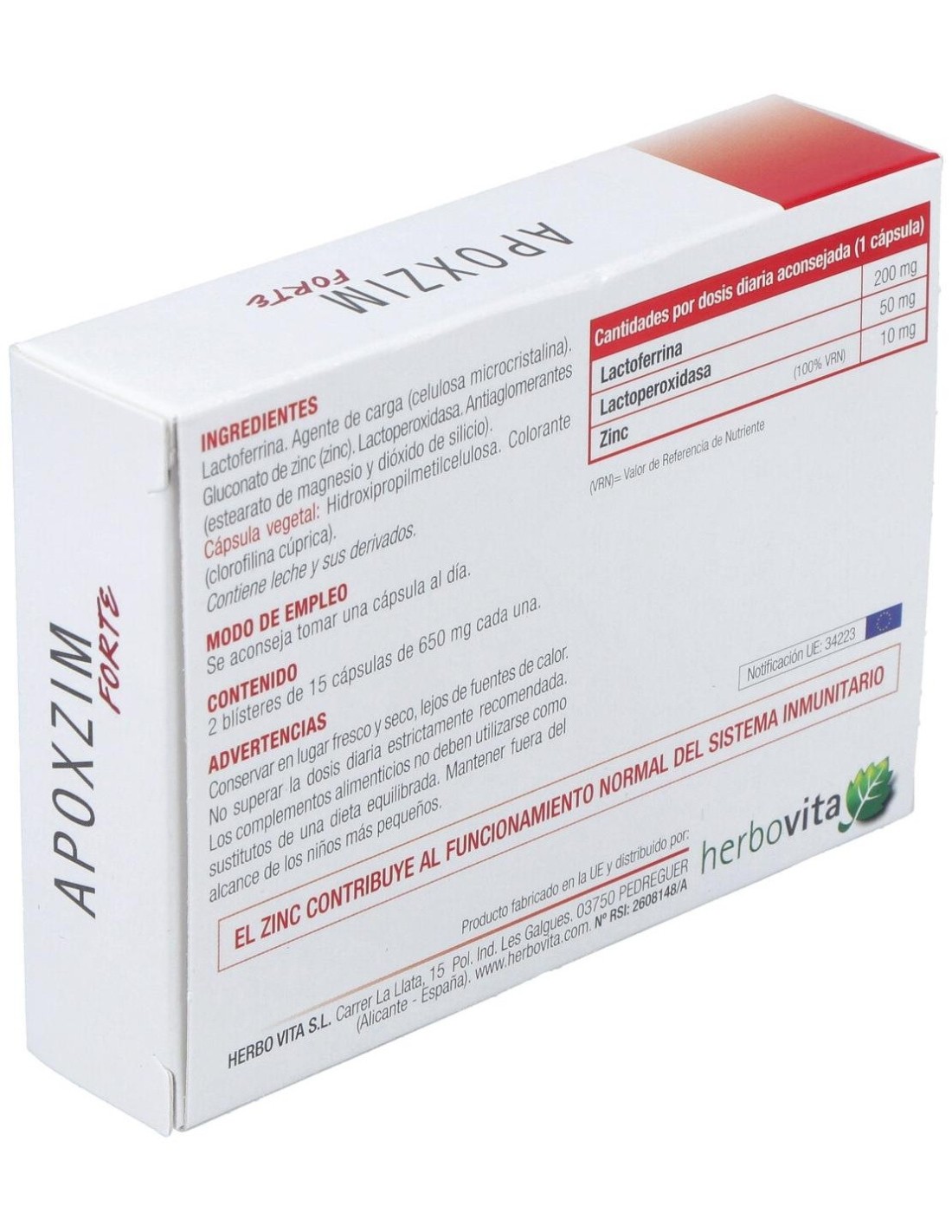 Complemento alimenticio en formato cápsulas, elaborado con una combinación a base de lactoferrina, lactoperoxidasa y zinc, que actúa com un potente antibiótico natural. Contribuye al funcionamiento normal del sistema inmunitario, o a reforzarlo en procesos de infección por virus, hongos o bacterias.