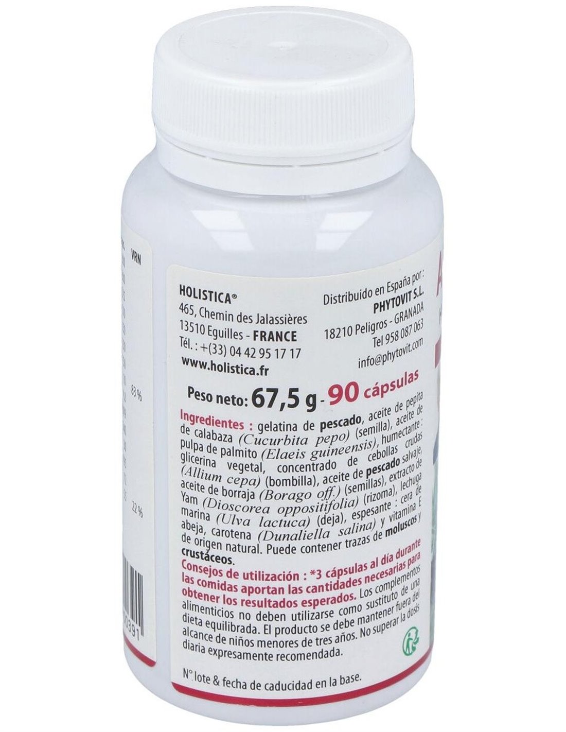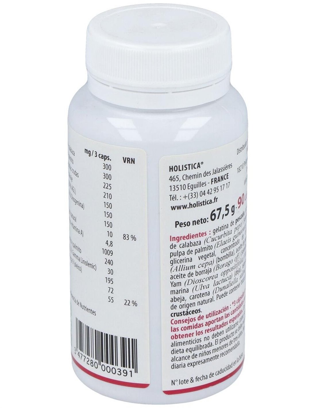 Aceite de semillas de calabaza de primera presión en frío, Aceite de pulpa de palmito no hidrogenada (con 44% de ácido láurico), Concentrado de cebolla, Aceite de Pescados de mar (con 18% de EPA y 12% de DHA), Aceite de borraja de primera presión en frío (con 20% de ácido gamma-linolénico) total de extracto de Yam (Ñame Silvestre), espesante: cera de abeja, carotenos de origen natural, Vitamina E de origen natural. Cápsula de gelatina de pescados.