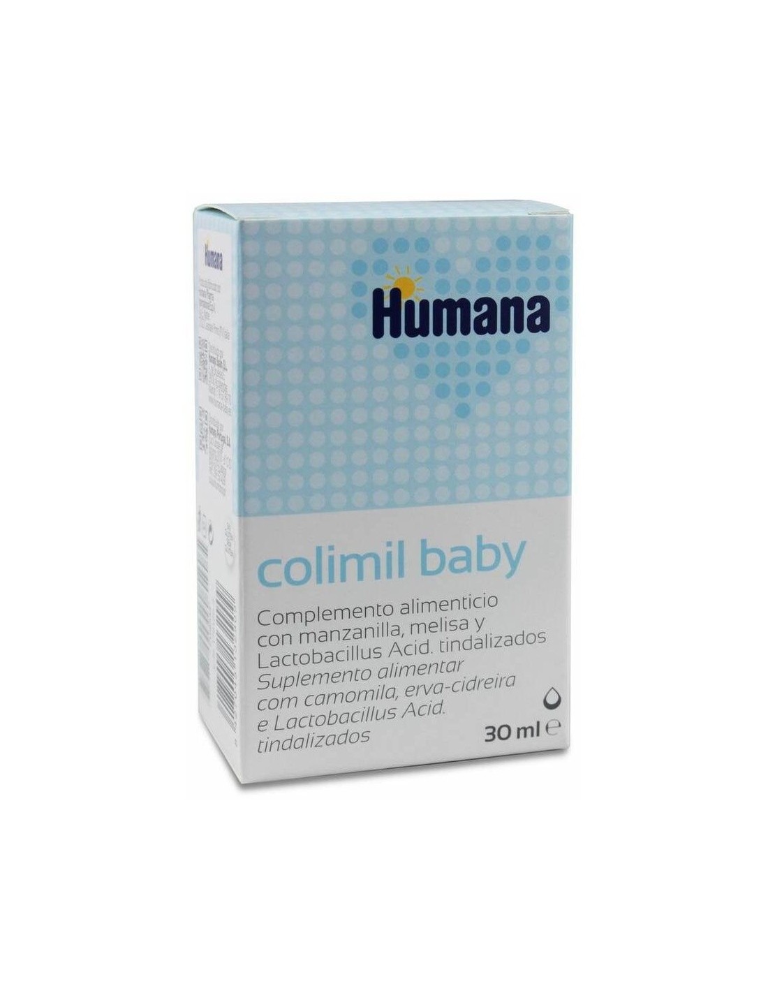 HUMANAComplemento alimenticio a base de extractos de manzanilla y melisa, y probióticos (Lactobacillus acidophillus) tindalizados útiles en caso de molestias del cólico del lactante: los probióticos contribuyen al normal equilibrio de la flora intestinal. La manzanilla y melisa tienen propiedades calmantes y digestivas. Para niños desde el nacimiento. Dosificación y administración sencilla mediante la jeringa dosificadora.