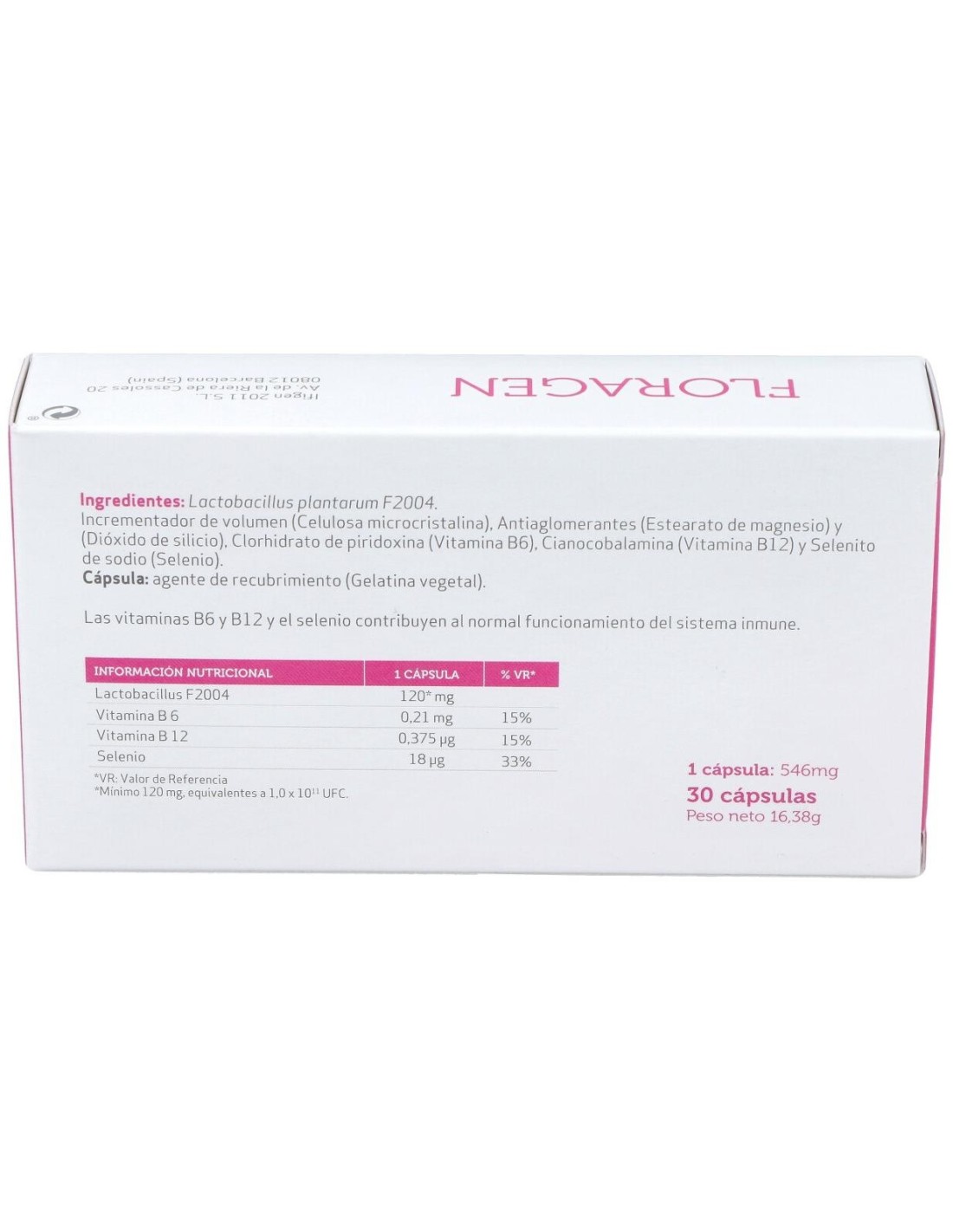 Lactobacillus plantarum F2004. Incrementador de volumen (Celulosa microcristalina), Antiaglomerantes (Estearato de magnesio) y (Dióxido de silicio), Clorhidrato de piridoxina (Vitamina B6), Cianocobalamina (Vitamina B12) y Selenito de sodio (Selenio). Cápsula: agente de recubrimiento (Gelatina vegetal).