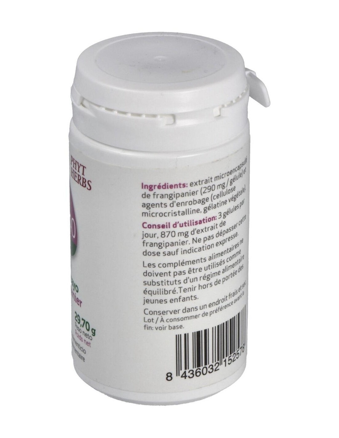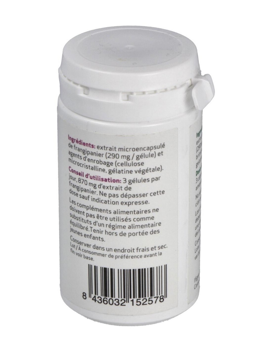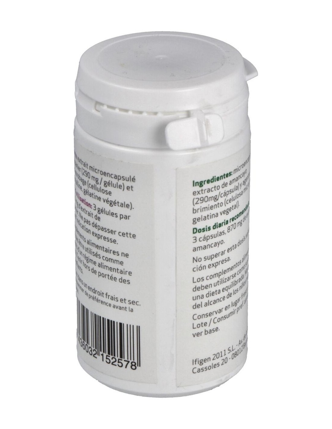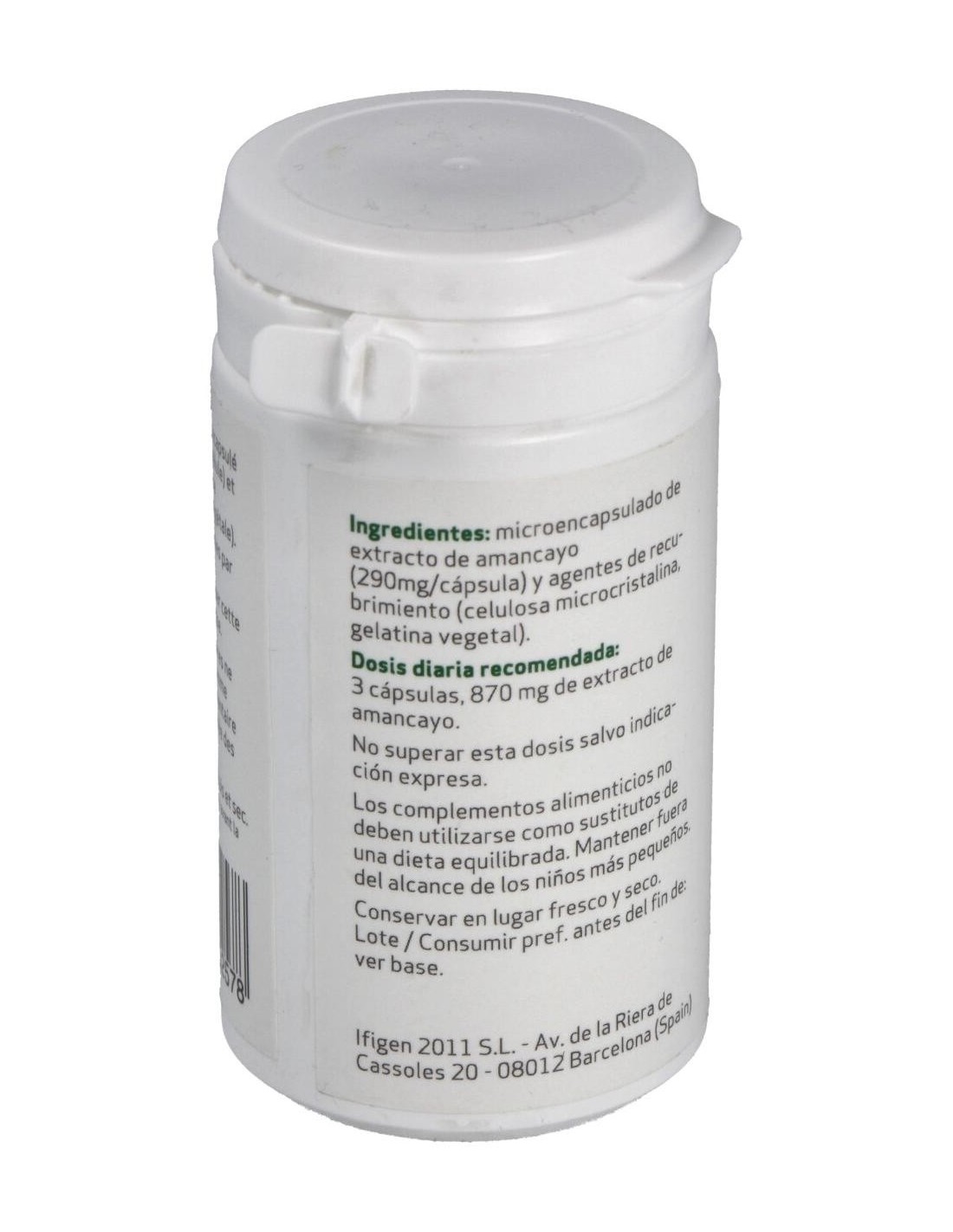Microencapsulado de extracto de amancayo (290 mg/cápsula) de los que 40 mg son alcaloides (gesmospermina y flavopererina). Agentes de recubrimiento (celulosa microcristalina, gelatina vegetal).