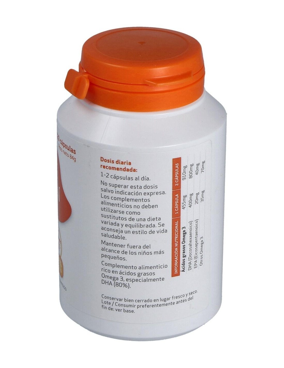 Aceite de pescado DHA 80% antioxidantes (alfa-tocoferol, ß y tocoferol, ð-tocoferol, palmitato de ascorbilo y galato de propilo). Cápsula: gelatina de pescado.