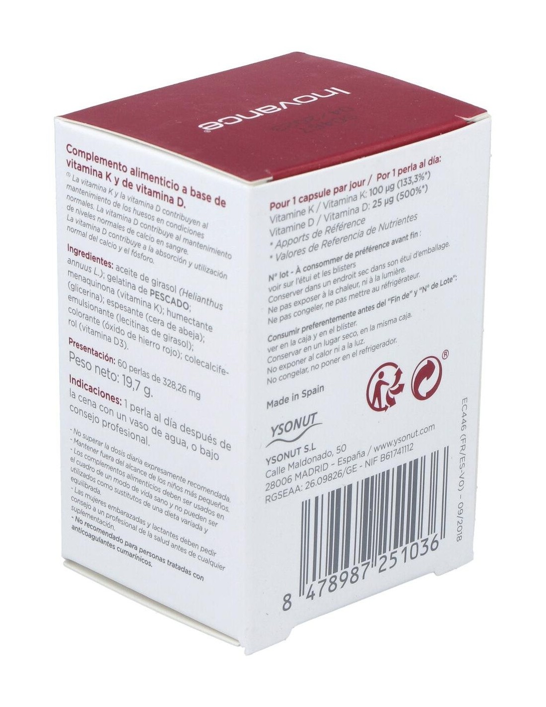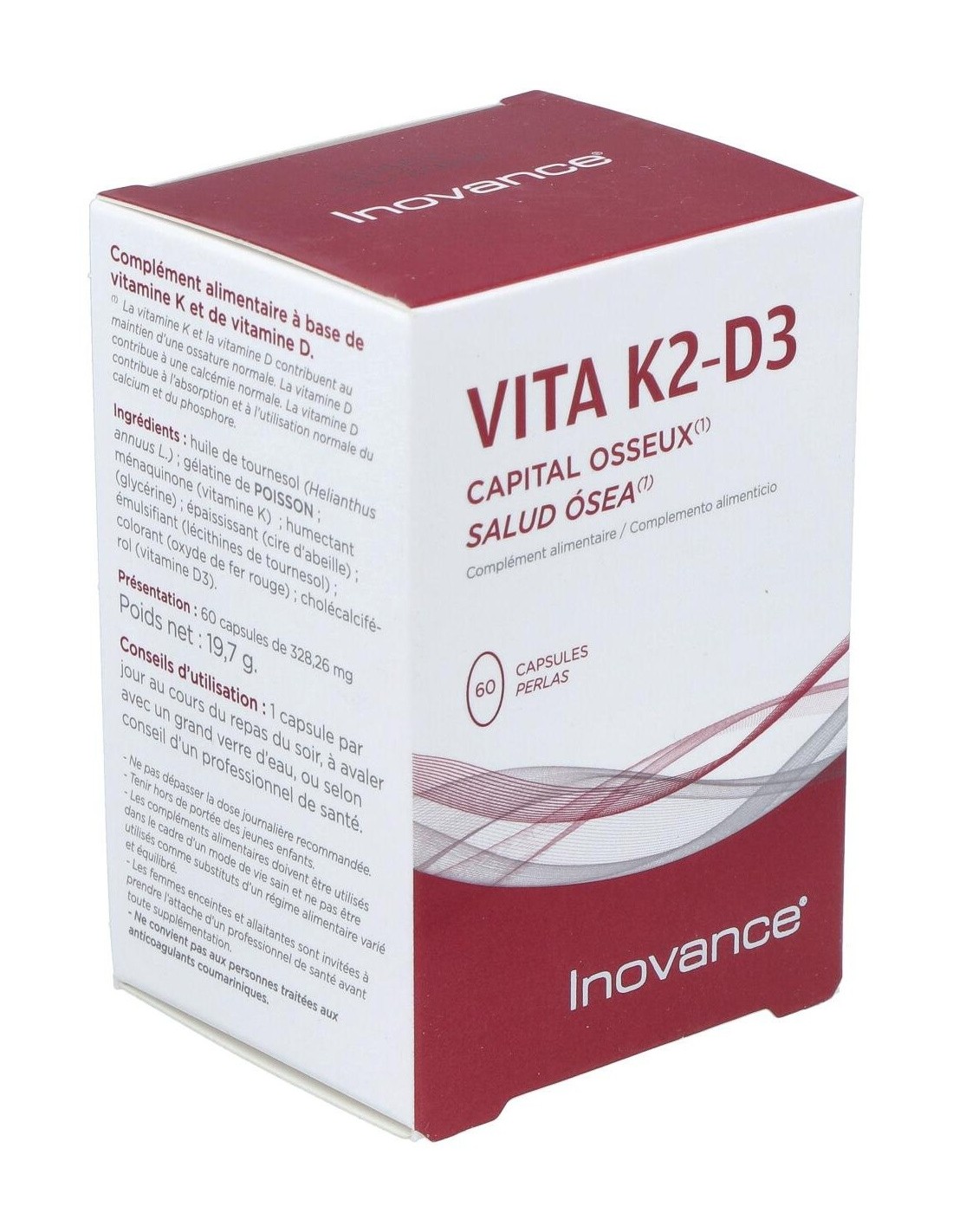 Inovance Vita K2 D3 Salud Ósea 60caps es un complemento alimenticio que contribuye a la salud normal de los huesos, gracias a su fórmula rica en vitaminas K y D.