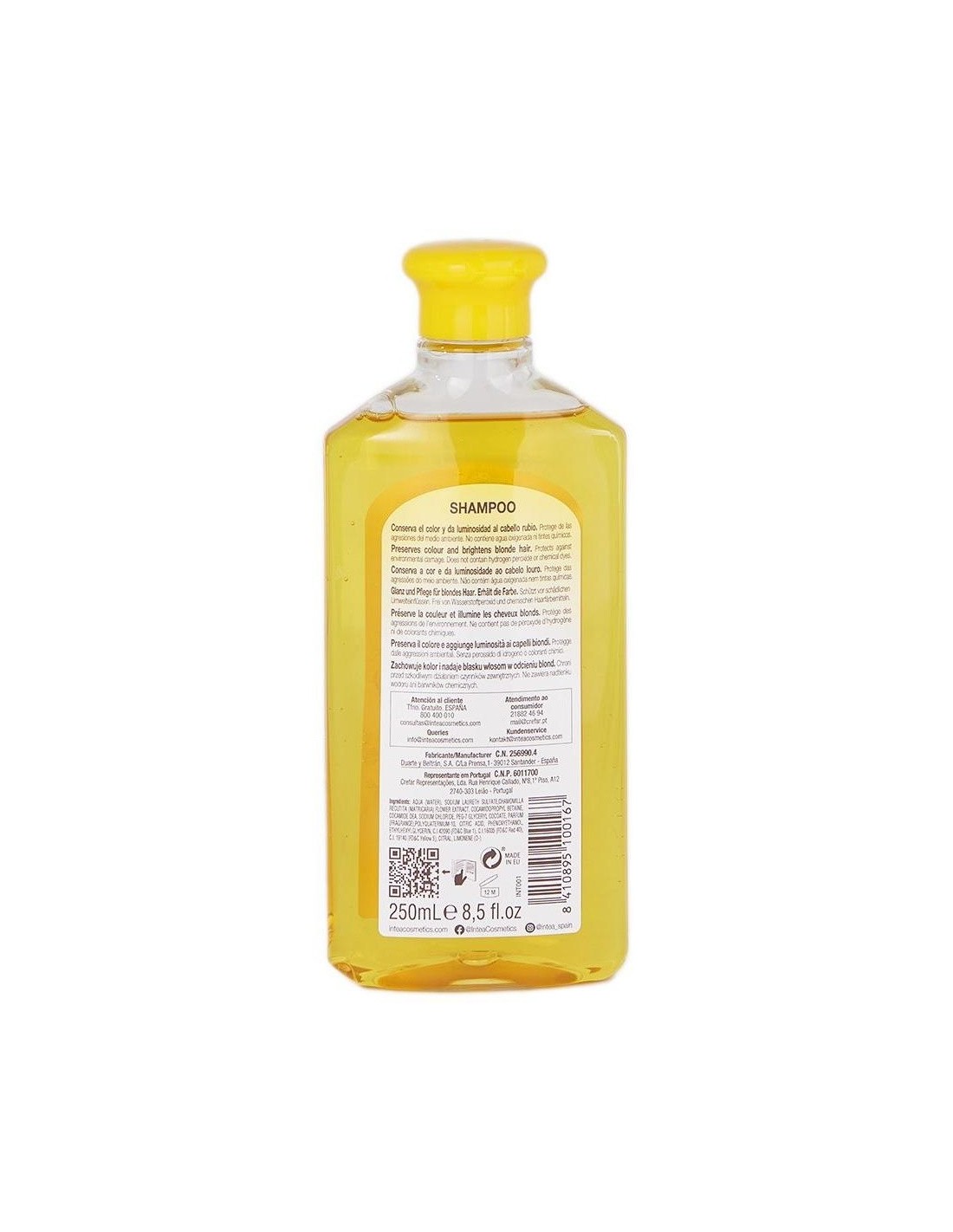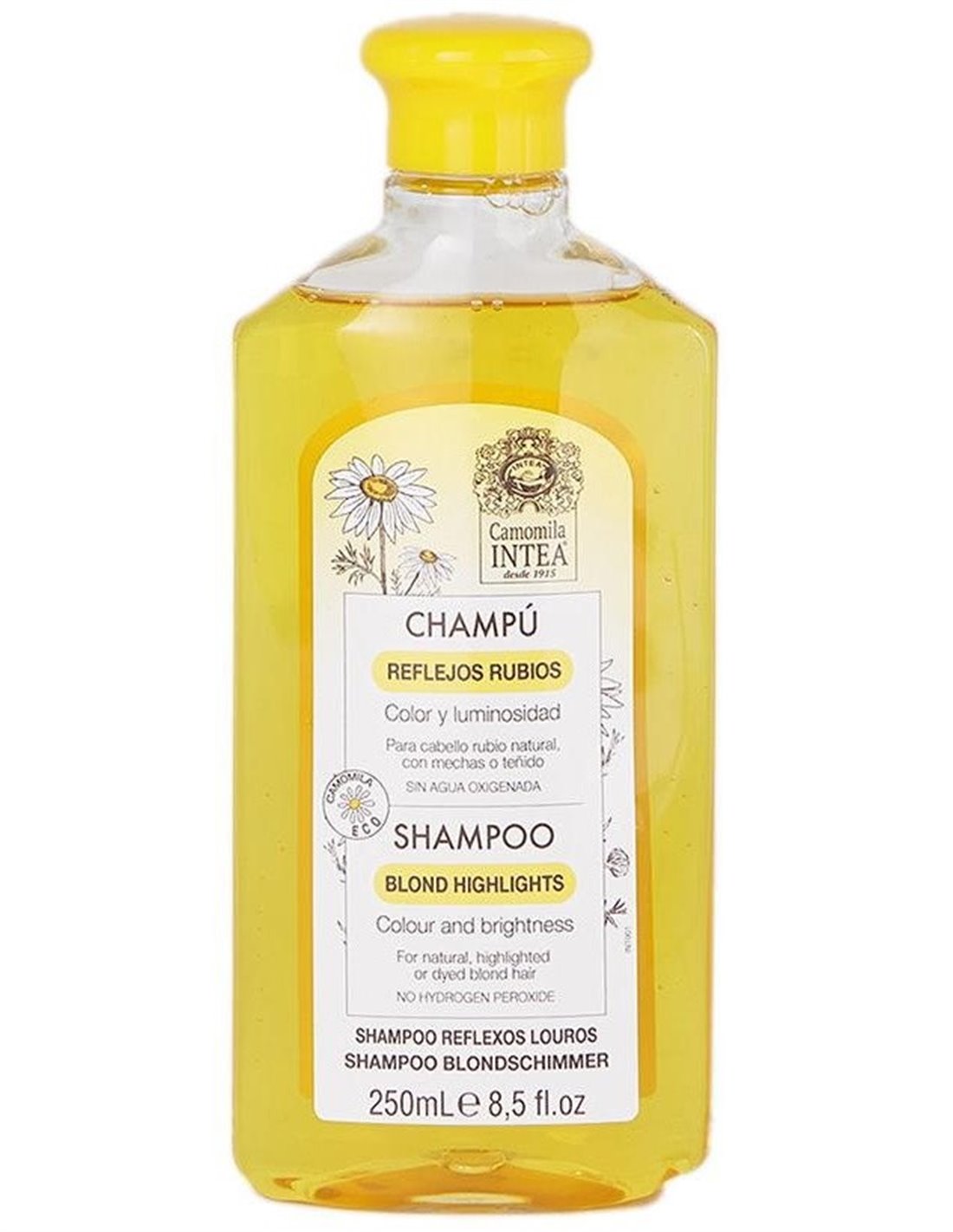 Champú indicado especialmente para el lavado de cabellos rubios ya sean naturales, teñidos o aclarados con nuestros productos. Proporciona un brillo intenso, luminosidad y reflejo al cabello rubio. Su uso habitual aclara ligeramente el cabello potenciando las mechas. Complemento ideal de los productos aclarantes Intea® para conseguir un mejor acabado. Suave y agradable olor de las flores de manzanilla. No contiene siliconas ni parabenos. No testado en animales.