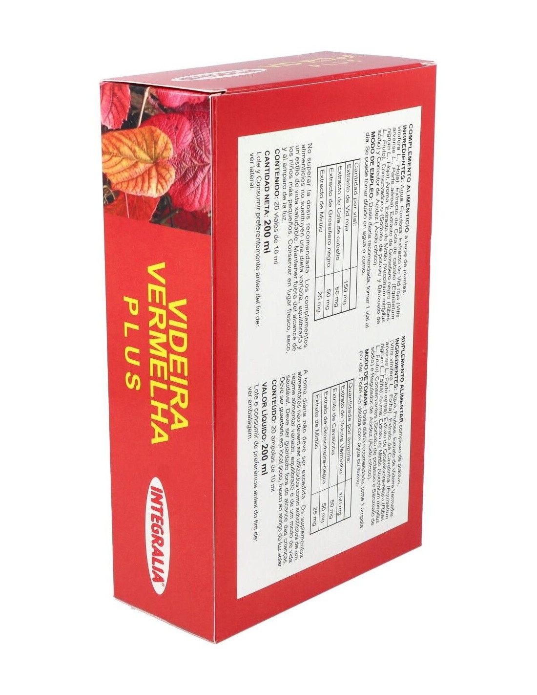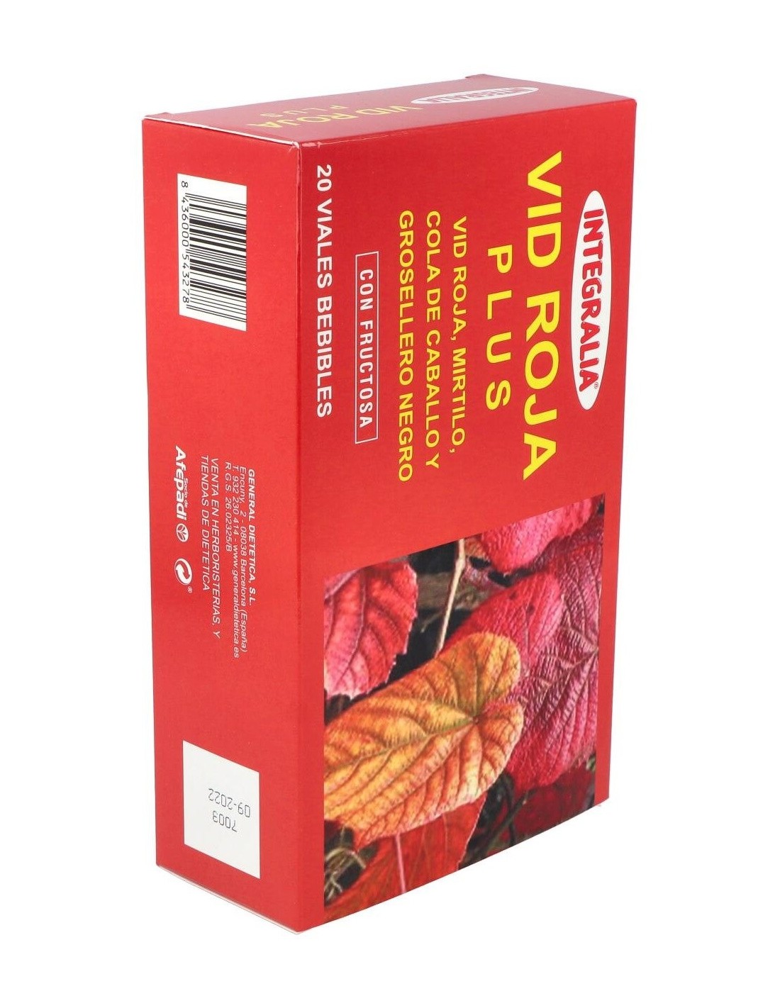 Envase de 20 viales visibles de vid roja elaborado por Integralia. Este producto es utilizado para mejorar la circulación venosa de los pacientes con problemas asociados a las varices u otras enfermedades de carácter cardiovascular. Además de su ingrediente principal, cuenta con diente de león, mirtilo y extracto de grosellero negro. Estos componentes ayudan a prevenir riesgos coronarios que puedan traer complicaciones más serias. No se recomienda usar en menores de doce años ni en embarazadas sin consulta previa de un médico especialista. Con varios años de venta en el mercado, es un artículo confiable para la familia.