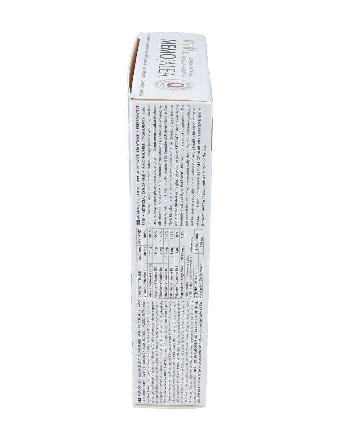 Jalea real 500 mg (máx. contenido en 10-HDA). Glicerofosfato de magnesio. Polvo de alga litotamno (Lithothamnium calcareum, 20% de calcio). Vitaminas C, E, B1, B2, B3, B6 y B12. Aceite de salmón (microencapsulado). Excipientes: agua, fructosa líquida (edulcorante), jugo de naranja concentrado (sabor), aceite esencial de mandarina (aroma).