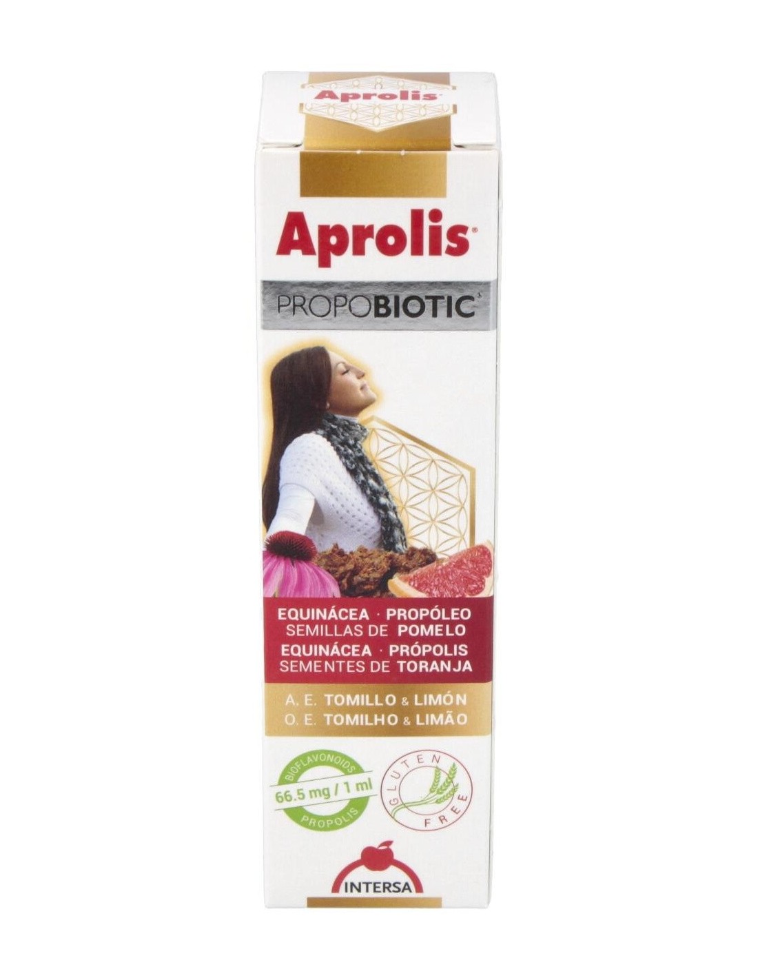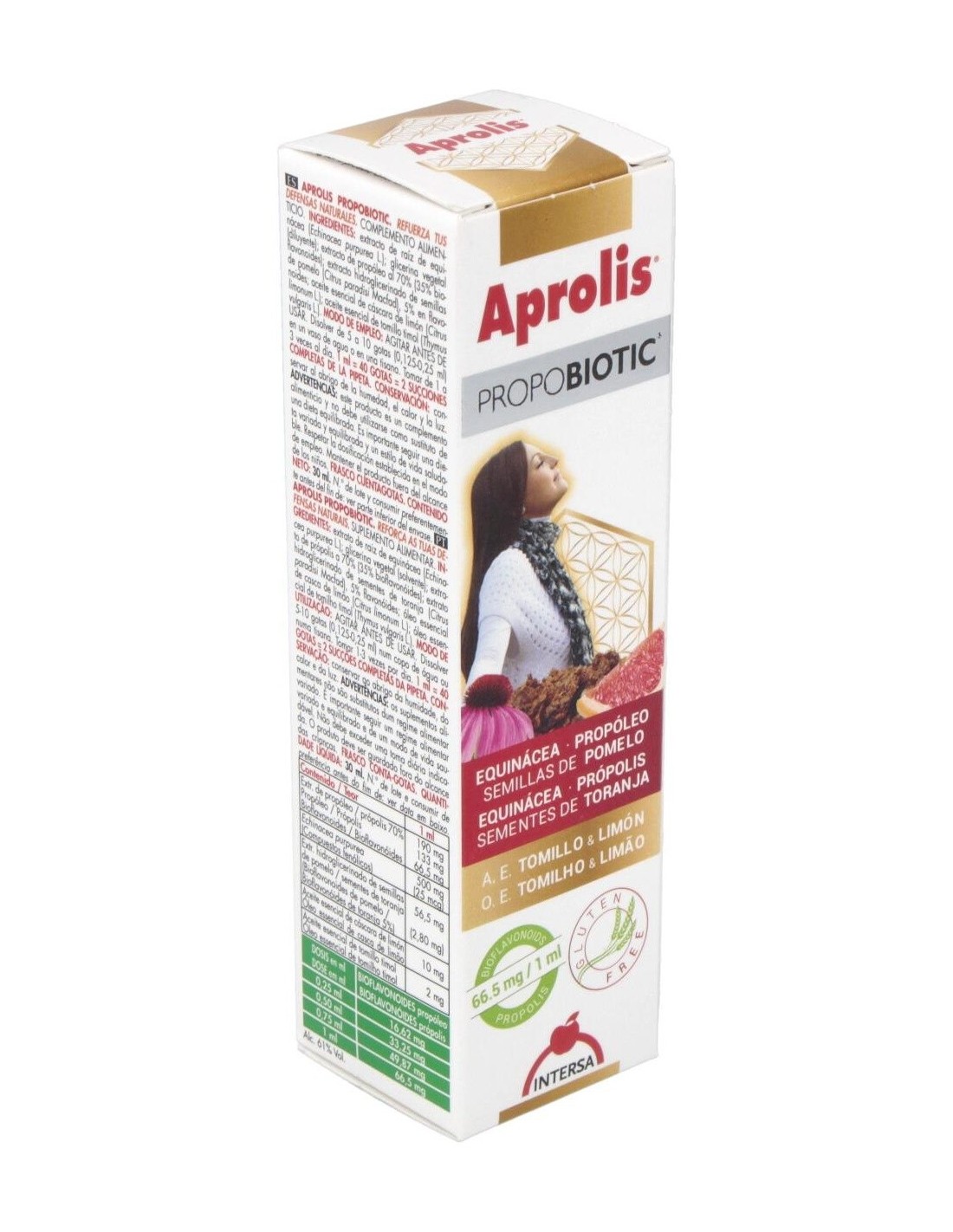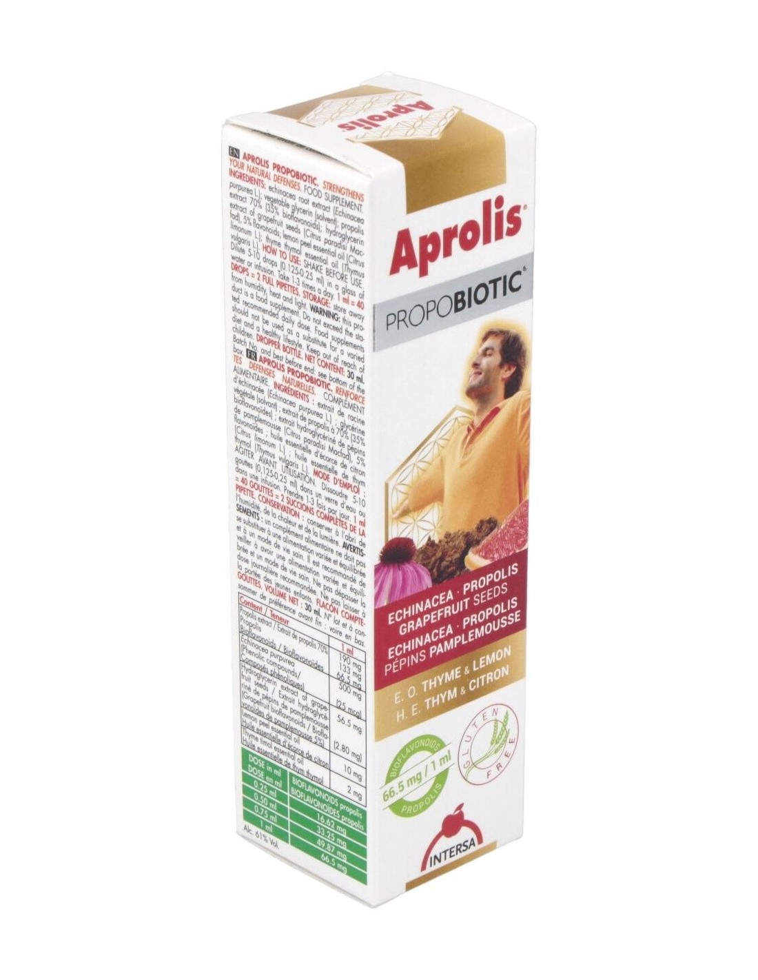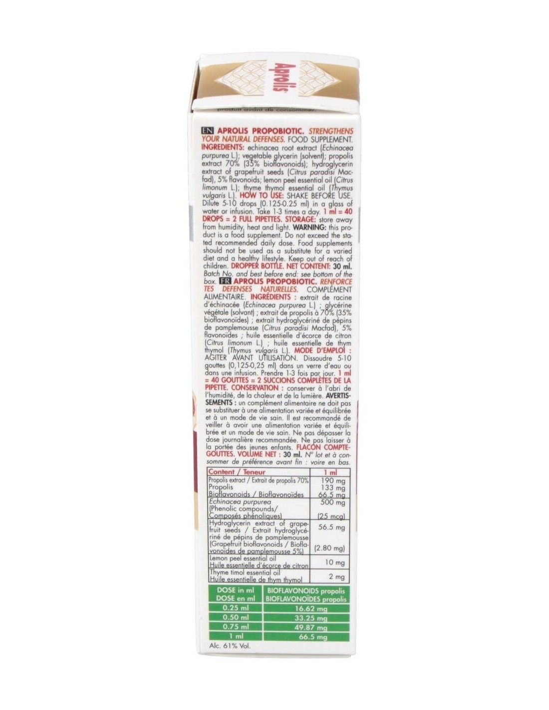 Complemento alimenticio que ayuda a reforzar las defensas con equinácea, propóleo, semillas de pomelo y aceites esenciales de tomillo y limón. Extractos de plantas y de propóleo obtenidos por maceración en alcohol procedente de la fermentación de vegetales BIO (bioetanol). no contiene propilenglicol - no contiene alcohol etílico. 100% natural.