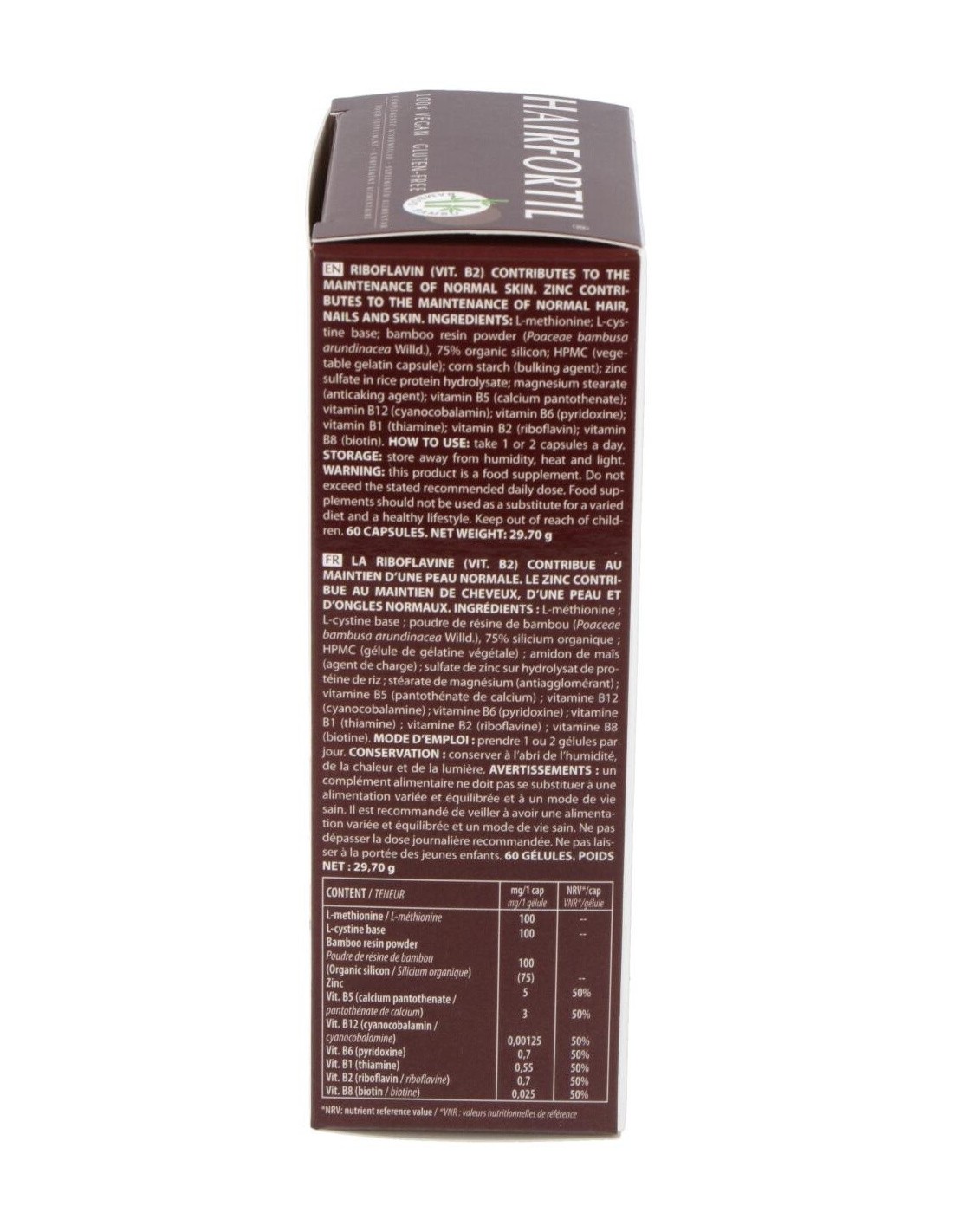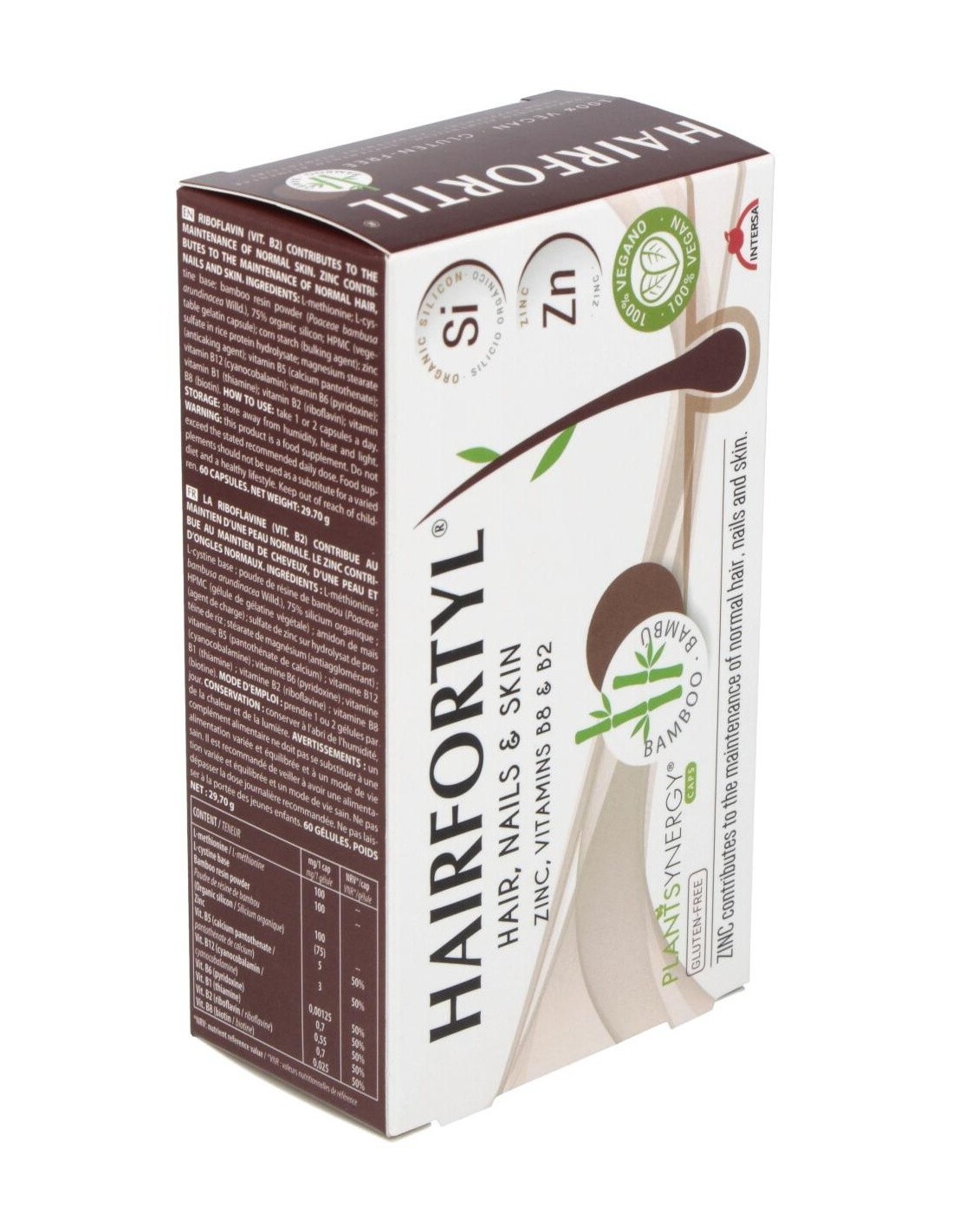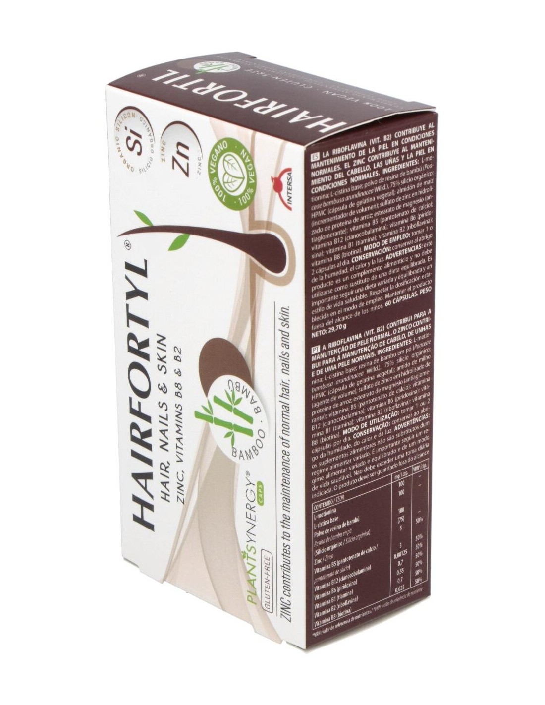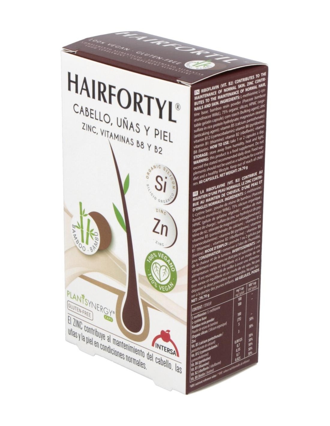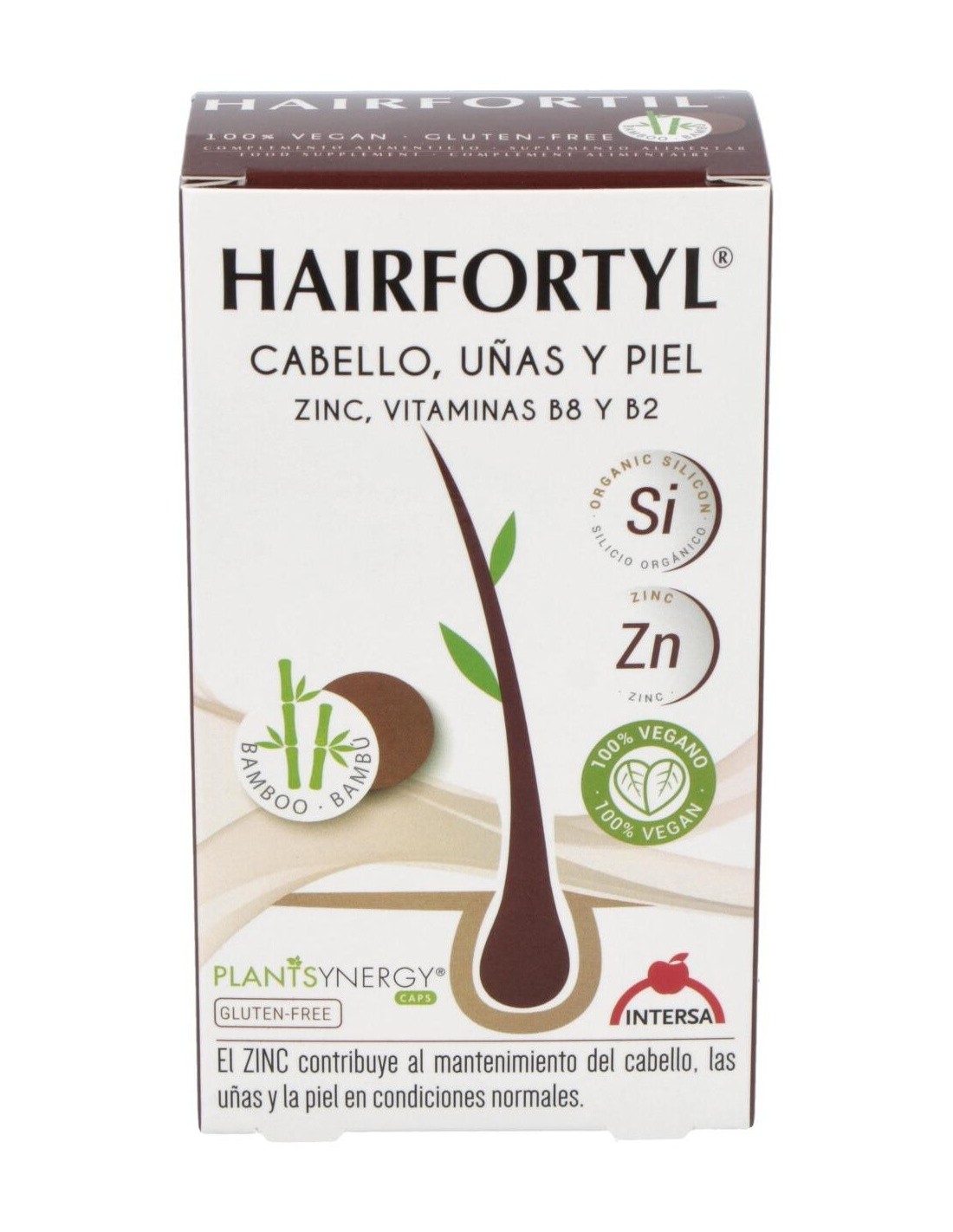 Complemento alimenticio que contribuye al mantenimiento del cabello, piel y uñas en condiciones normales. 100 % vegano. El zinc contribuye al mantenimiento de la piel, las uñas y el cabello en condiciones normales. La vitamina B2 contribuye al mantenimiento de la piel en condiciones normales. La vitamina B6 contribuye a la síntesis normal de la cisteína. La vitamina B8 (Biotina) contribuye al mantenimiento de la piel y el cabello en condiciones normales. La cisteína es un aminoácido que forma parte de las estructuras de la piel y las uñas.