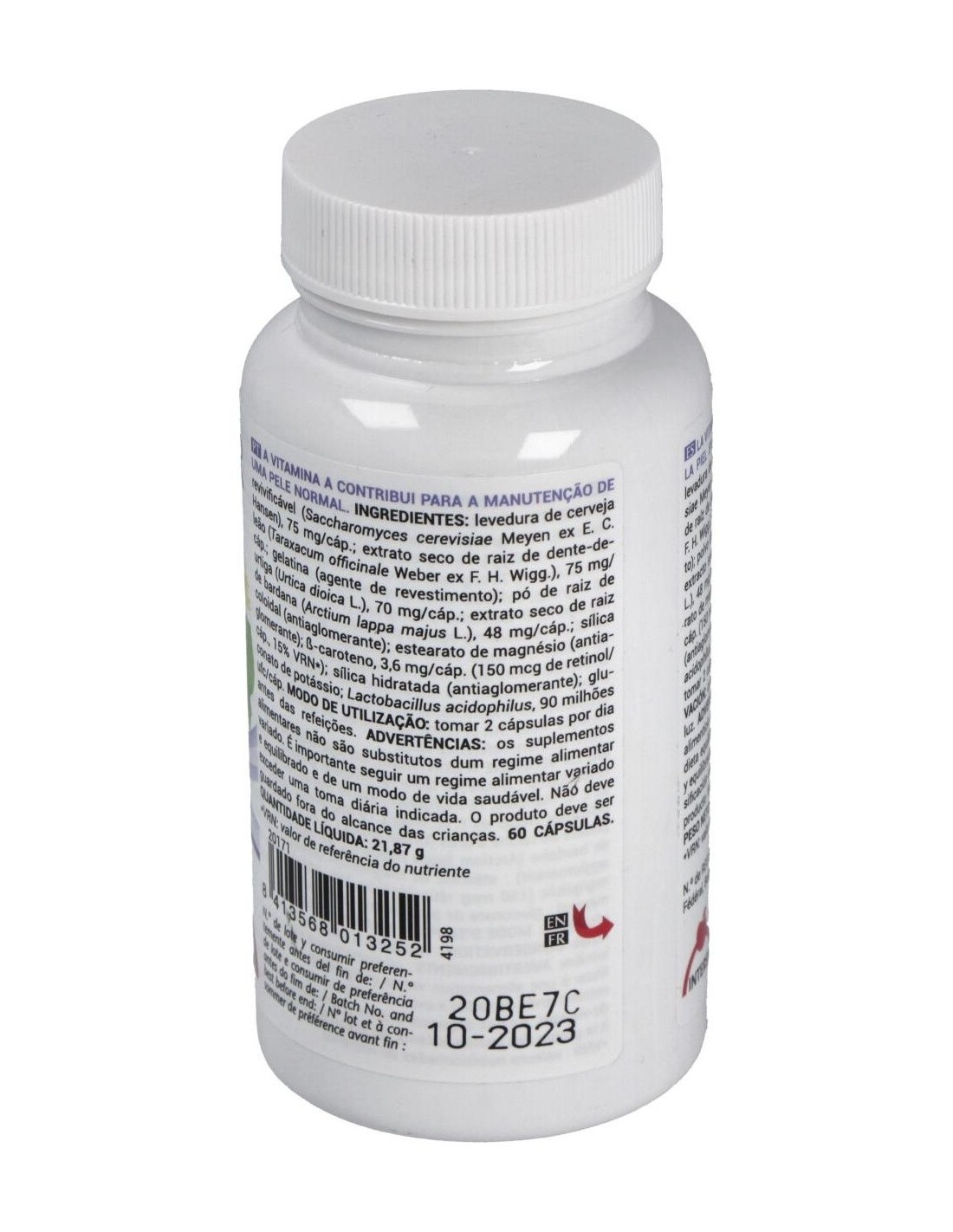 Complemento alimenticio formulado a base de levadura de cerveza, ortiga y diente de león. Contiene lactobacillus acidophilus. Contribuye a la expulsión de toxinas del organismo. A sus ingredientes se le atribuyen propiedades depurativas. Es usado en casos de acné, estreñimiento o afecciones gastrointestinales. Indicado para adultos.