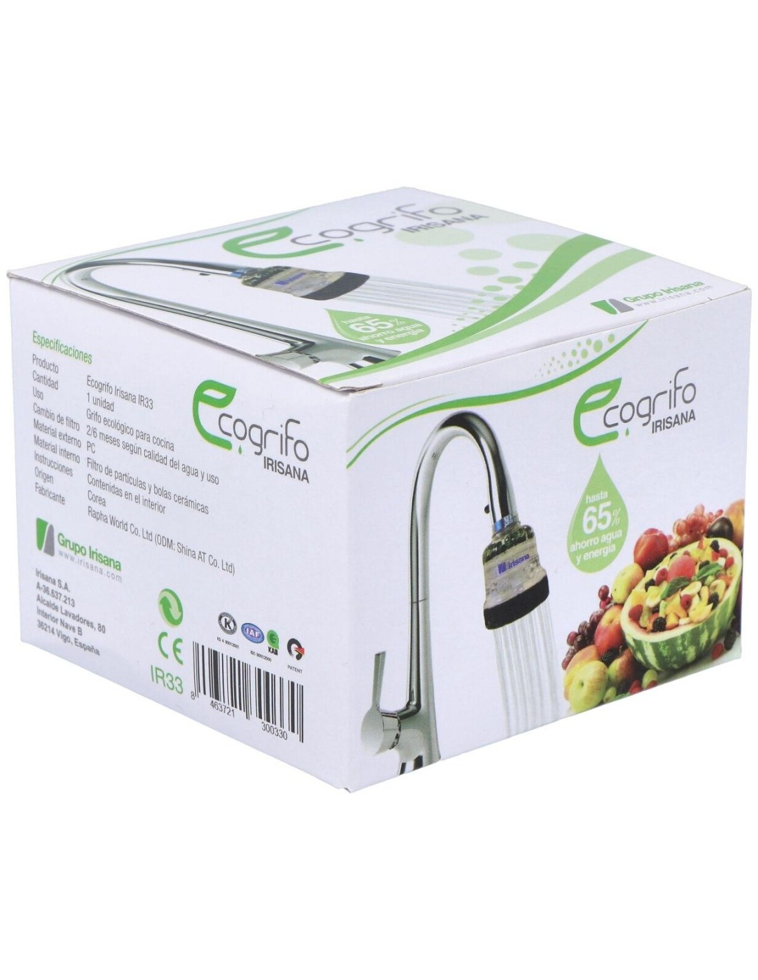 Ecogrifo de la marca Irisana, producto diseñado y elaborado para mejora la calidad del agua para cocinar, beber y limpiar.El dispositivo limpia en mayor profundidad alimentos como frutas, verduras, pescados y los mantiene más frescos.