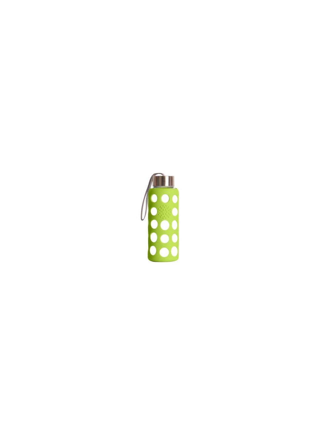 Botella reutilizable de vidrio de Borosilicato, más resistente a latas y bajas temperaturas que el vidrio convencional. Con funda de silicona. Libre de BPA, Ftalatos, PVC y metales pesados.
