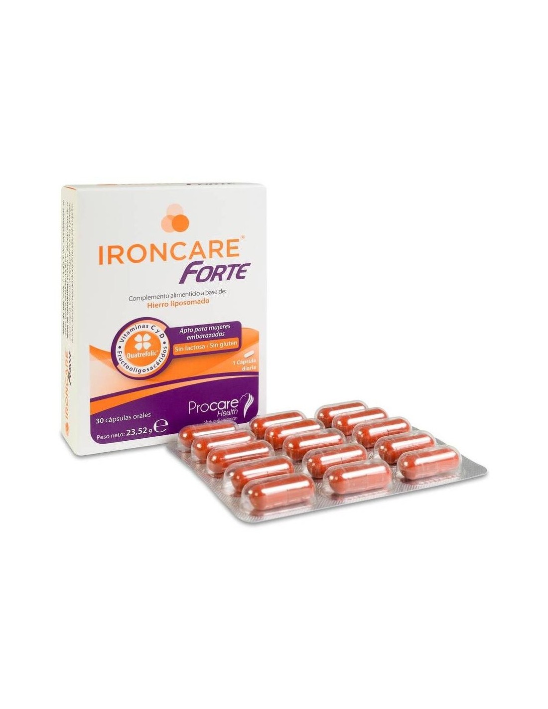 Ironcare Forte Cápsulas Está Formulado Con Lipofer (Pirofosfato De Hierro Liposomado), Cápsula De Origen Vegetal, Ácido L-Ascórbico (Vitamina C), Fructooligosacáridos De Achicoria (Cichorium Intybus L), Agente De Carga: Celulosa Microcristalina, Antiaglomerante: Estearato De Magnesio De Origen Vegetal, Gluconato De Cobre, Colecalciferol (Vitamina D3), Antiaglomerante: Dióxido De Silicio, Cianocobalamina 0,1% (Vitamina B12), Colorante: Óxido De Hierro Rojo, Quatrefolic (Ácido (6S)-5-Metiletrahidrofólico, Sal De Glucosamina) (Ácido Fólico), Selenito De Sodio.