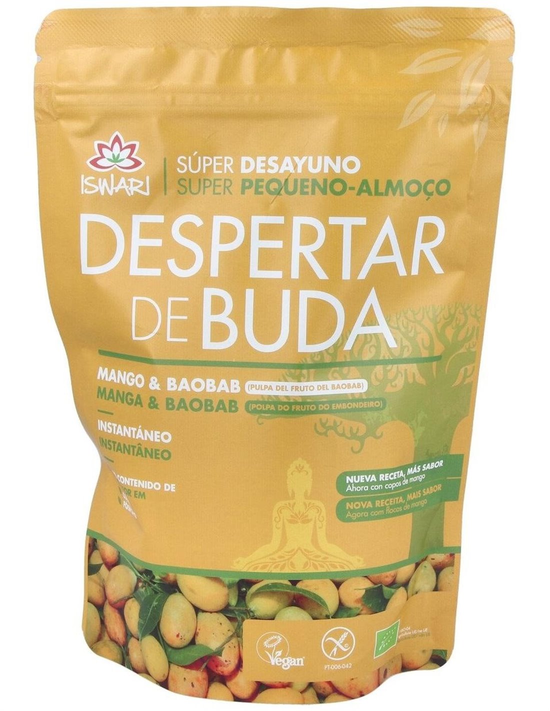 Mezcla para desayuno de despertar de Buda con Mango y Baobab de la marca Iswari, mezcla para un desayuno de preparación rápida e instantánea, simplemente añadiendo agua o una bebida vegetal. Esta combinación de varios ingredientes con alto contenido nutricional es la opción ideal para iluminar tu desayuno o merienda. El perfecto equilibrio entre hidratos de carbono, proteínas, grasas saludables y micronutrientes esenciales. El producto contiene alto contenido de manganeso, magnesio, fósforo, cobre y fibra. Alto contenido de ácidos grasos omega-3. El producto cumple los estándares europeos y es testado periódicamente para la detección de metales pesados, pesticidas y otros contaminantes. El baobab (Fruto del baobab): es consumido y apreciado por su delicioso sabor cítrico. Este producto cumple los estándares europeos y es testado periódicamente para la detección de metales pesados, pesticidas y otros contaminantes. AVISO DE ALERGÉNIOS: Sin gluten. Contiene frutos de cáscara (almendras). Puede contener trazas de granos de sésamo, avena (sin gluten), cacahuetes y de frutos de cáscara (avellanas).