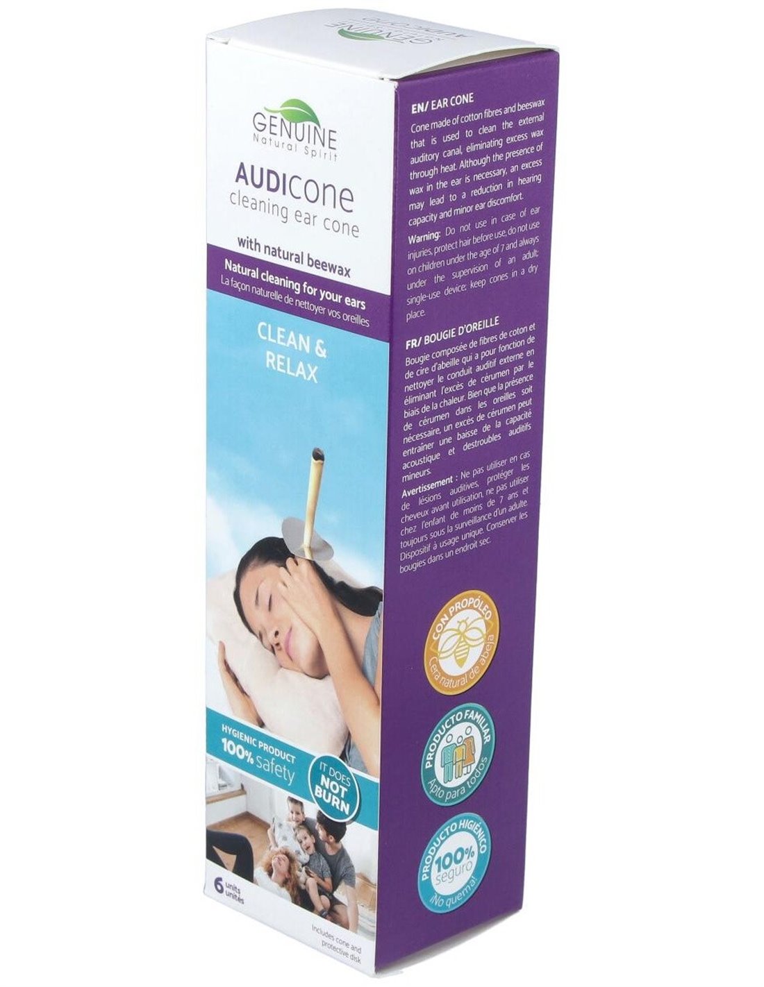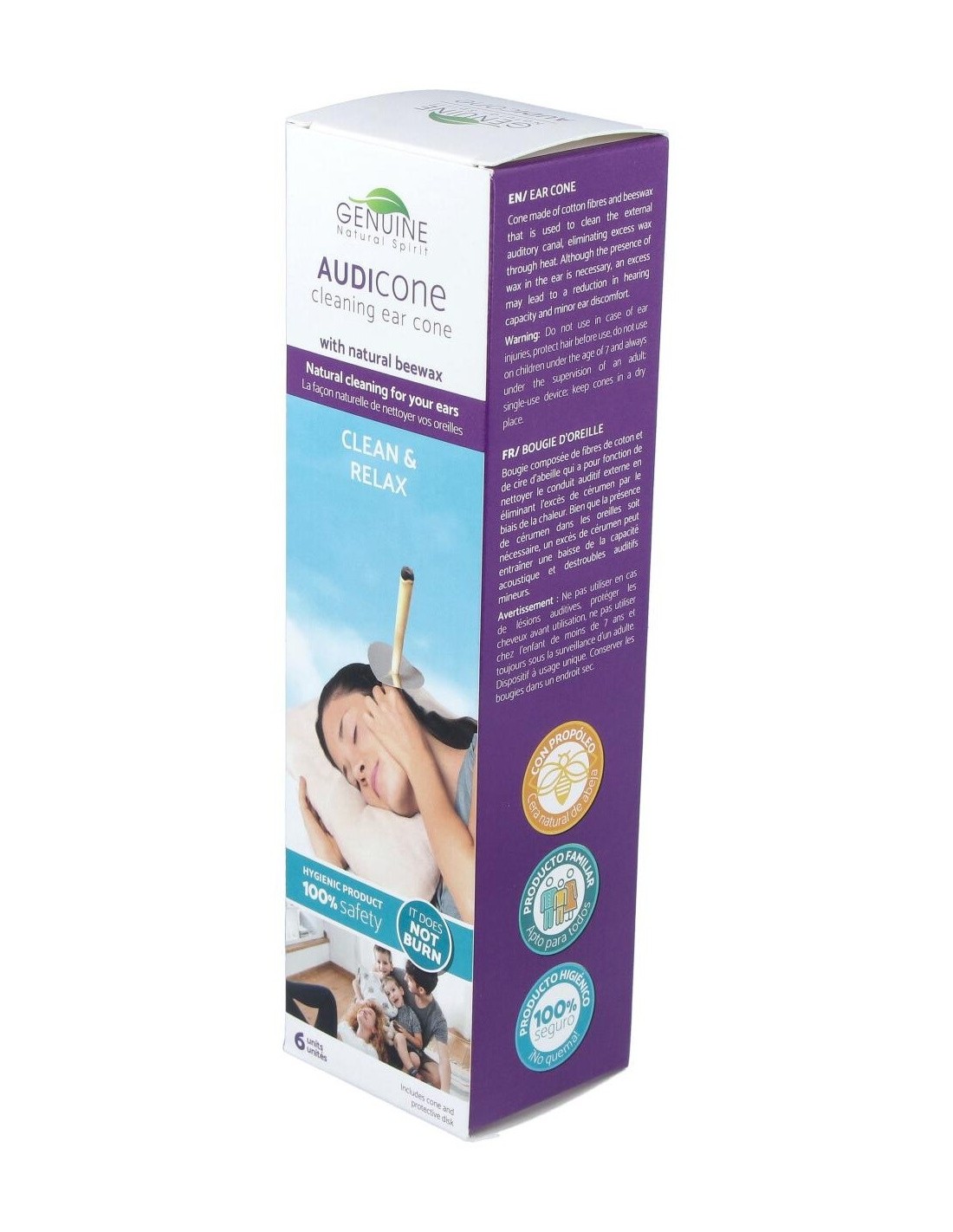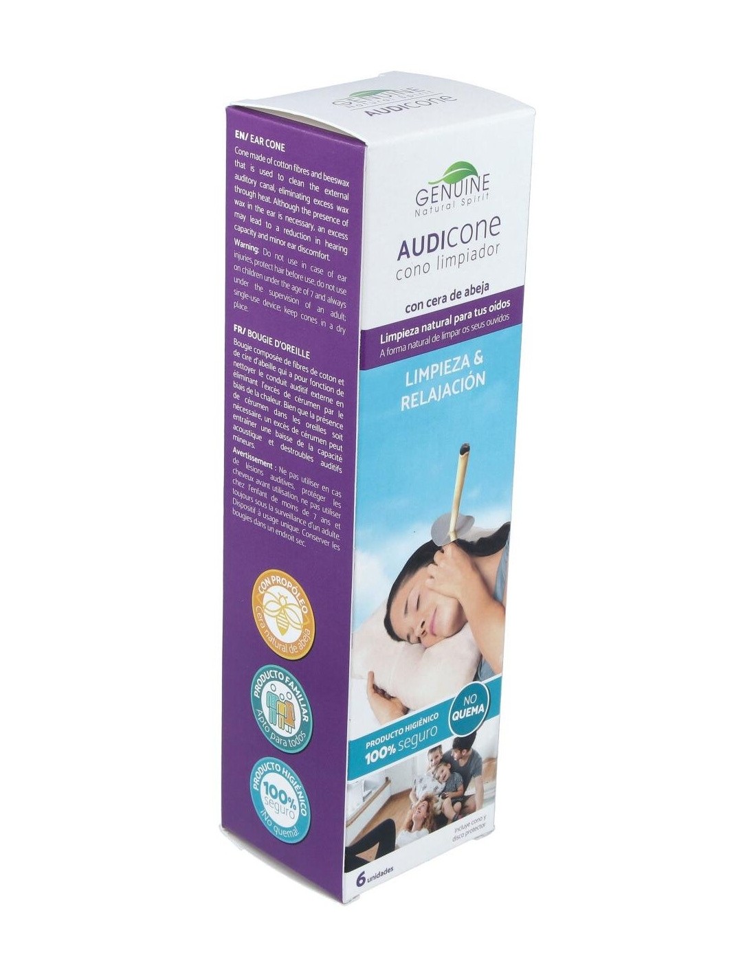 Realizado con tejido natural y cera, contribuye a la eliminación de la cera de los oídos y restablece el equilibrio de la presión auricular evitando la desagradable sensación de oídos tapados.