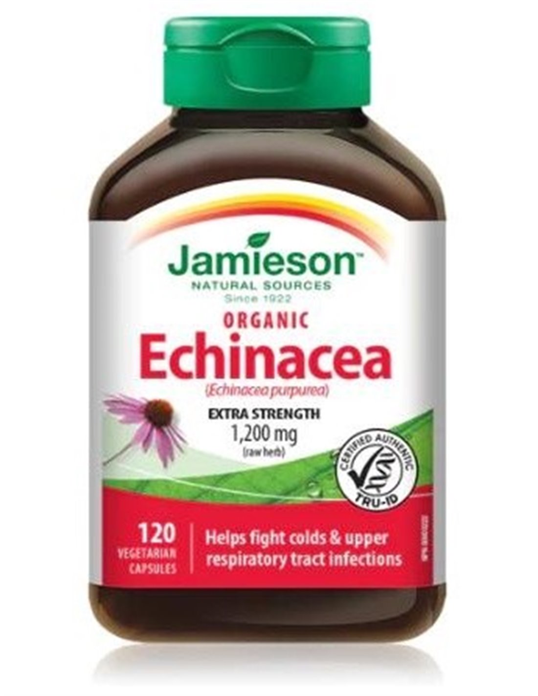 JAMIESONComplemento alimenticio a base de Equinácea, la cual actúa como apoyo en el sistema inmunitario. Indicado para adultos con síntomas de resfriado, con frecuentes procesos virales o que quieren dar soporte al normal funcionamiento del sistema inmunitario.\ \ El producto Equinacea extra fuerte 1200mg 120cap de la marca Jamieson es una fórmula orgánica de alta potencia de Echinacea purpurea pura. La presentación viene en un frasco con 120 cápsulas, lo que representa un suministro de varias semanas. Propiedades de la equinácea: es una planta que se ha utilizado en la medicina herbal para ayudar al normal mantenimiento del tracto respiratorio superior, de utilidad para la garganta y en caso de resfriados. La fórmula orgánica extra fuerte de este producto se obtiene a partir de Echinacea purpurea pura. Además, cada cápsula contiene 1200mg de Echinacea purpurea pura.