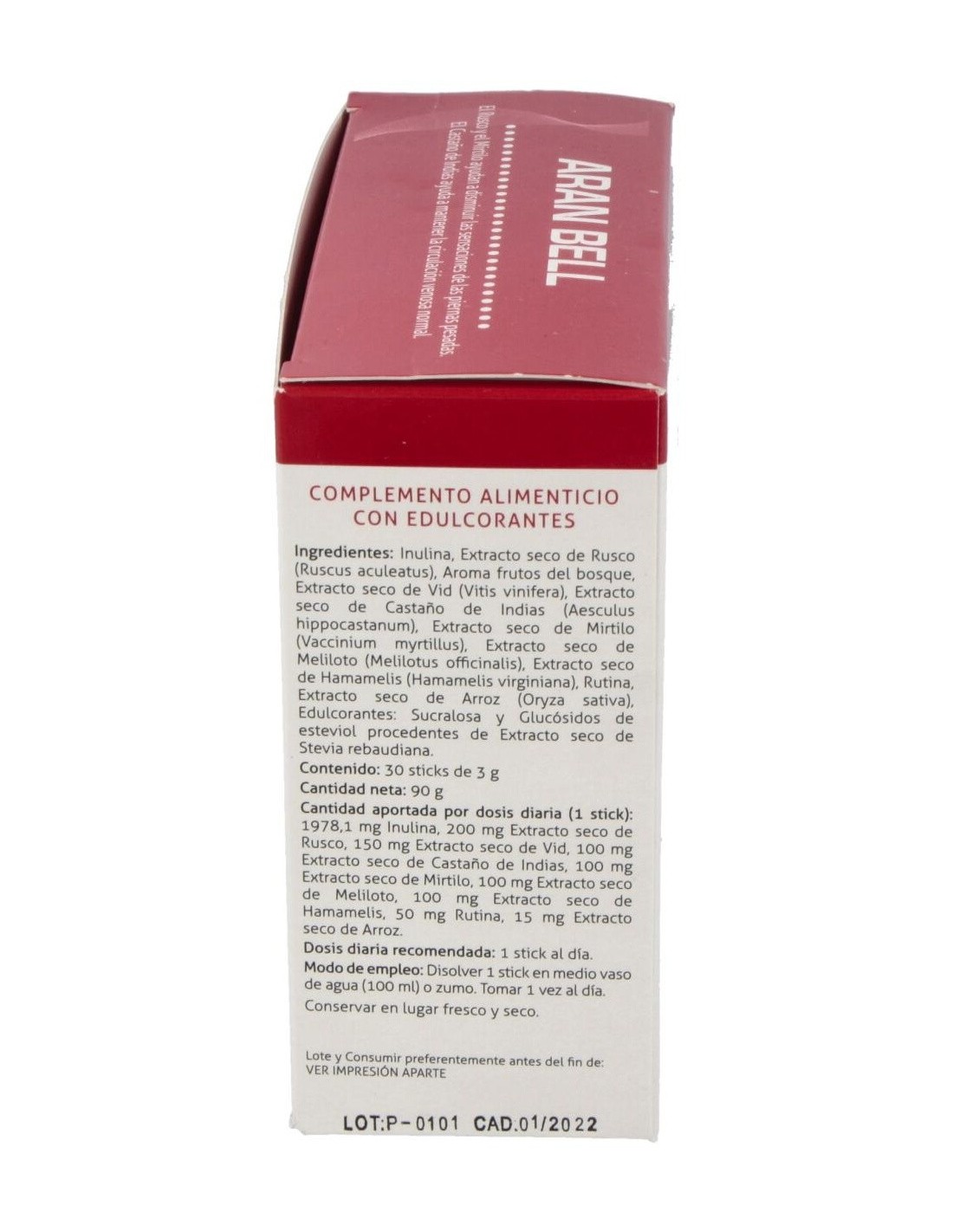Inulina, Extracto seco de Rusco (Ruscus aculeatus), Aroma frutos del bosque, Extracto seco de Vid (Vitis vinifera), Extracto seco de Castaño de Indias (Aesculus hippocastanum), Extracto seco de Mirtilo (Vaccinium myrtillus), Extracto seco de Meliloto (Melilotus officinalis), Extracto seco de Hamamelis (Hamamelis virginiana), Rutina, Extracto seco de Arroz (Oryza sativa), Edulcorantes: Sucralosa y Glucósidos de esteviol procedentes de Extracto seco de Stevia rebaudiana.