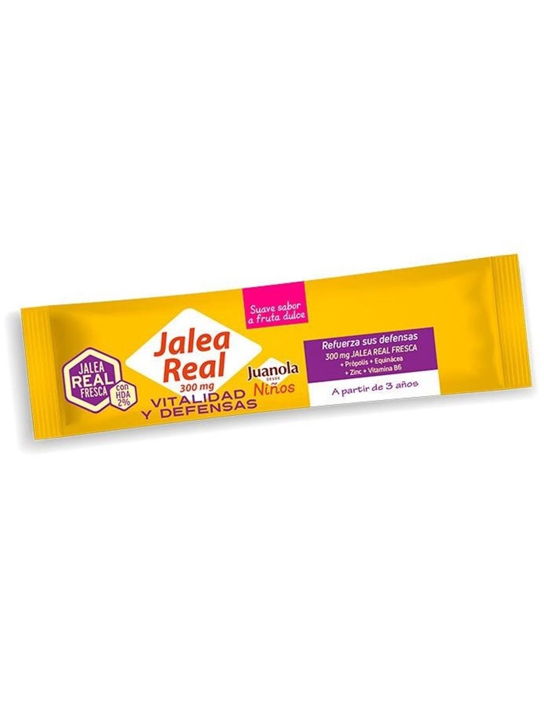 JUANOLAJuanola Jalea Real Vitalidad y Defensas es un complemento alimenticio con jalea real fresca, própolis, extracto de equinácea, zinc y vitamina B6, en formato sticks unidosis. El zinc y la vitamina B6 contribuyen al funcionamiento normal del sistema inmunitario. Además la vitamina B6 ayuda a disminuir el cansancio y la fatiga y contribuye al metabolismo energético normal. Producto sin gluten ni lactosa. Sabor suave a fruta dulce. Apto a partir de 3 años de edad.