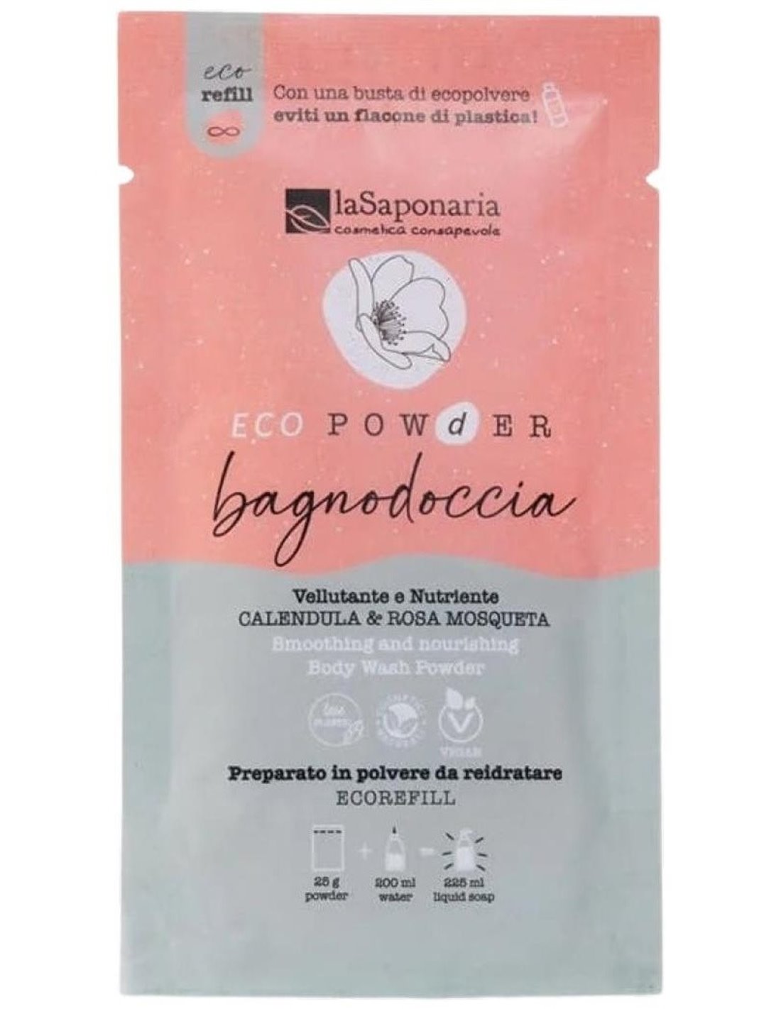 LA SAPONARIAGel de Ducha para Rehidratar, Aterciopelado y Nutritivo con Caléndula y Rosa Mosqueta. Es ideal para quienes aman tener una piel siempre hidratada y suave como el terciopelo. El formato en polvo para rehidratar es perfecto para quienes quieren decir adiós al plástico de un solo uso sin tener que renunciar a un dulce mimo diario para su piel. Con cada ducha, se liberarán dulces notas florales para promover la relajación y restaurar la serenidad y la armonía. Producto vegano.