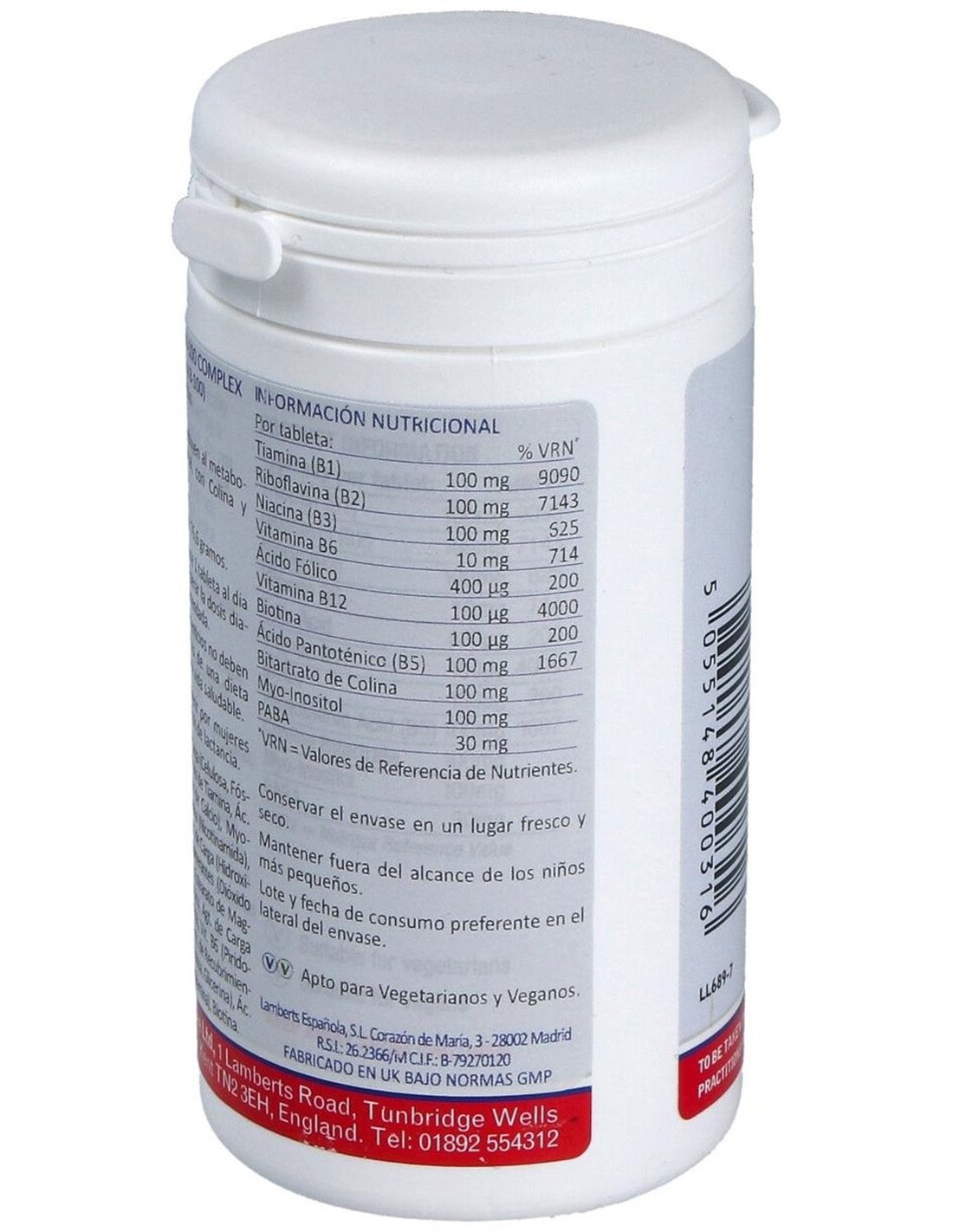 Las vitaminas del complejo B contribuyen al funcionamiento normal del sistema inmune y a la función psicológica normal, así como a la reducción del cansancio y la fatiga, mantenimiento normal de la piel, uñas y cabello, y al proceso de división celular entre otras funciones. Este complejo incluye todas las vitaminas B a unos niveles efectivos y equilibrados. Apto para veganos y vegetarianos.