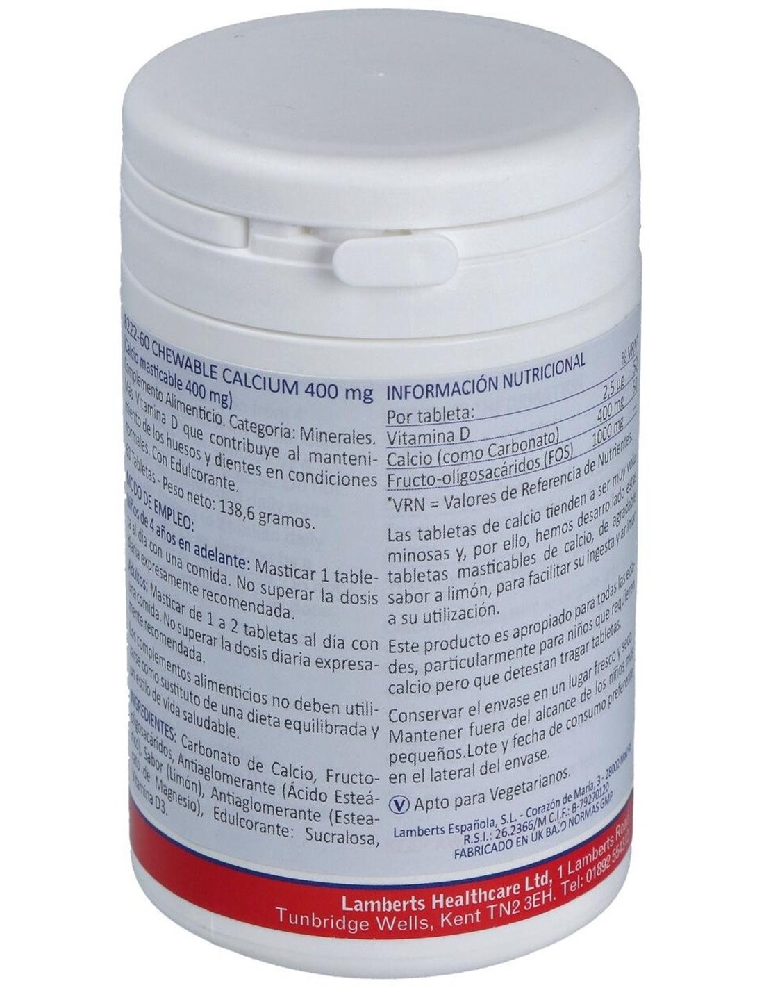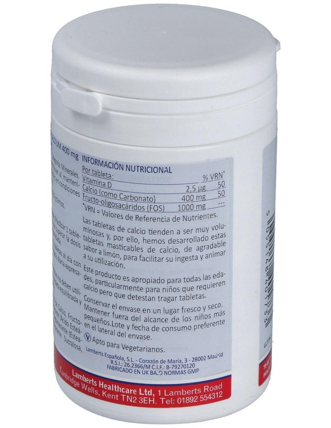 Calcio Masticable 400 mg (Con Vitamina D3 y FOS) de Lamberts