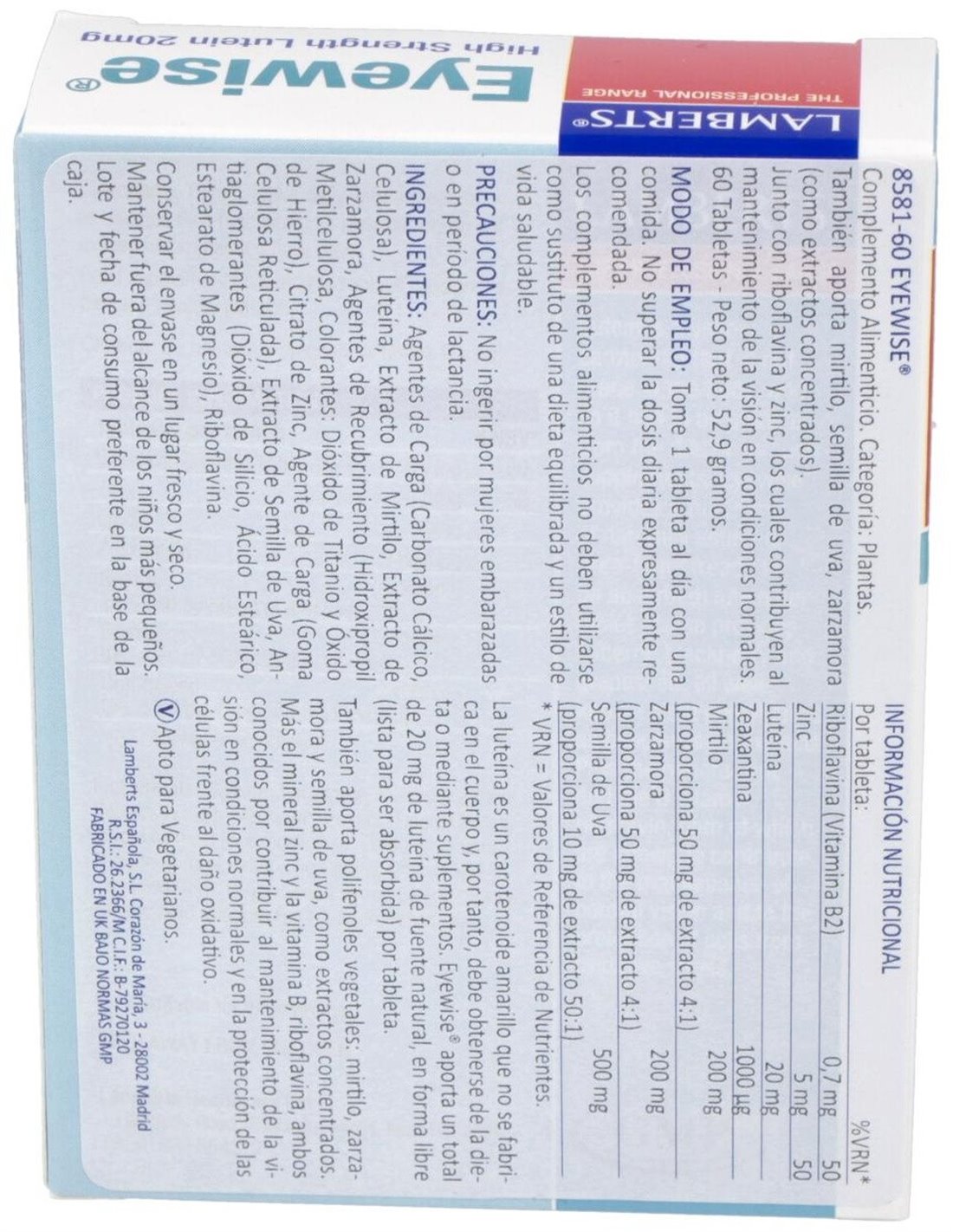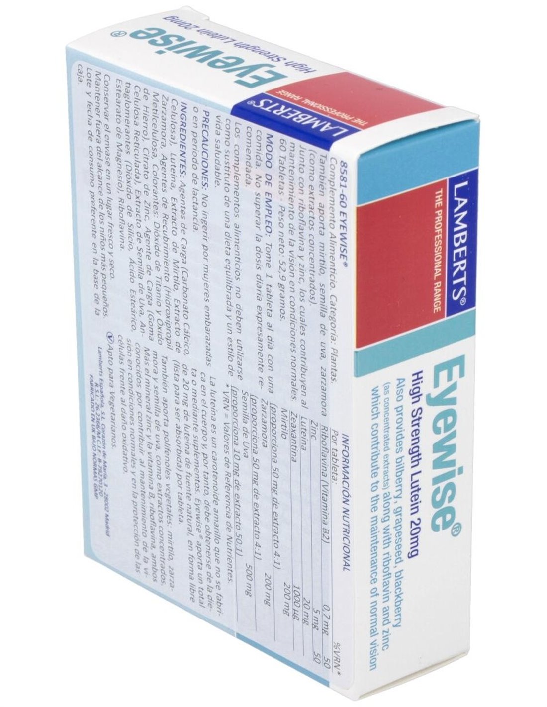 Lamberts Eyewise es un suplemento con luteína, zinc y vitamina B que ayuda a mantener el estado normal de la visión, proteger las células del daño oxidativo y cuidar el estado de los vasos sanguíneos del ojo.