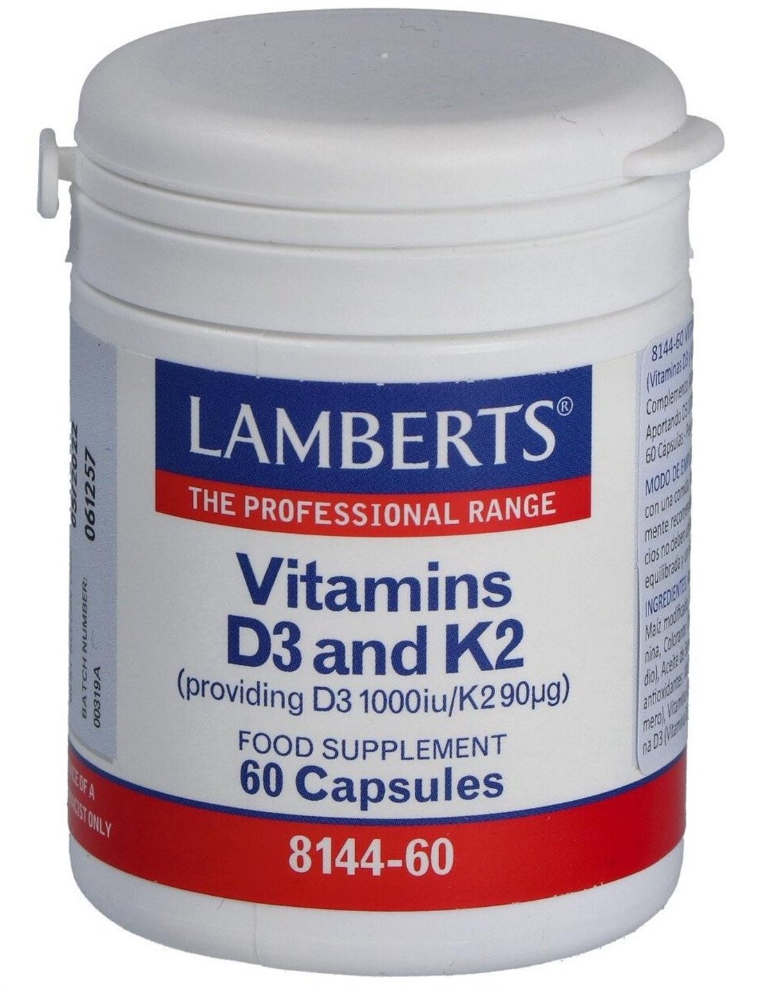 Este producto proporciona 1000 UI (25µg) de vitamina D3 natural (comom colecalciferol), así como 90 µg de vitamina K2 en forma de Menaquinona (MK-7) en pequeñas cápsulas fáciles de tragar. Esta sinergia contribuye al mantenimiento normal de los huesos y a la coagulación normal de la sangre. Apto para vegetarianos.