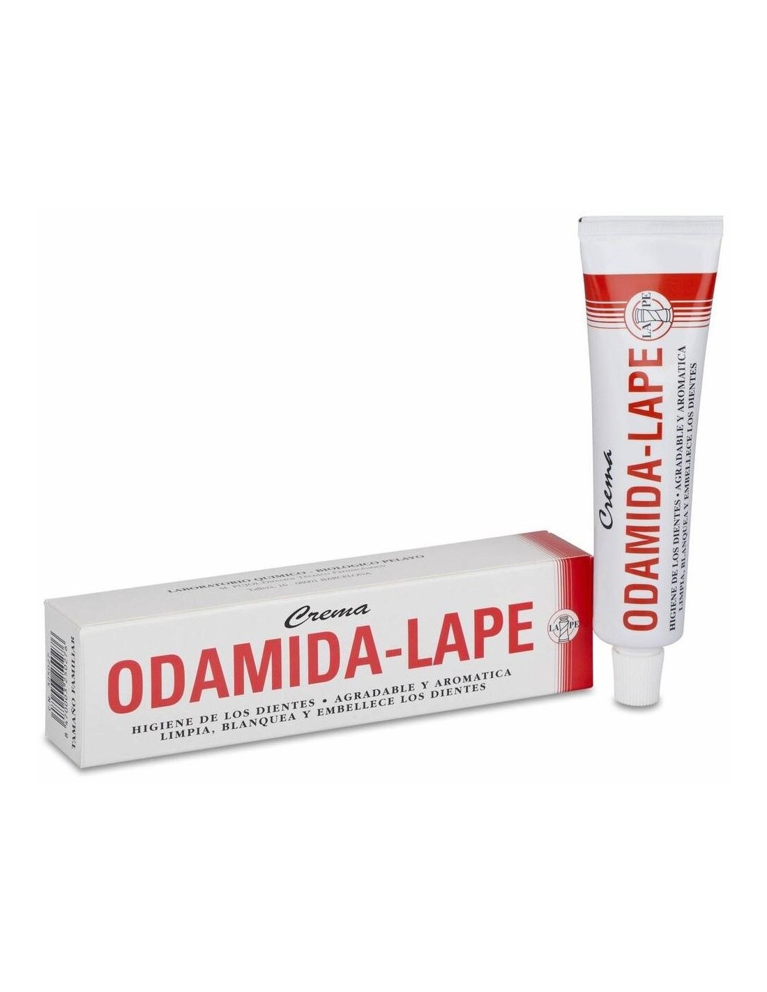 LAPELa crema Odamida-Lape es ideal para la limpieza y blanqueo de los dientes de una forma natural. En su composición se encuentran eficaces compuestos que con el cepillado frecuente de los dientes facilitan, tras el enjuague de la boca, la expulsión de los residuos alimenticios que se depositan en los dientes, dificultando la formación patológica de la placa microbiana. El Carbonato de Calcio que contiene, provoca un efecto blanqueante que sin dañar el esmalte de los dientes, arrastra los depósitos nocivos que se depositan e incrustan sobre éste, devolviéndole su blancura original. La acción refrescante producida por sustancias aromáticas como la Menta y el Mentol, favorecen la eliminación del mal aliento, dando a la boca una agradable sensación de bienestar.
