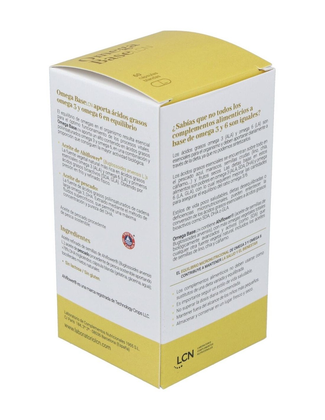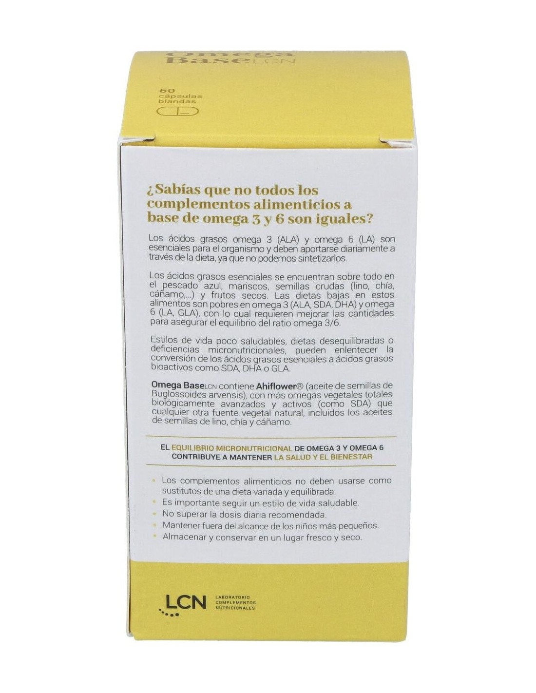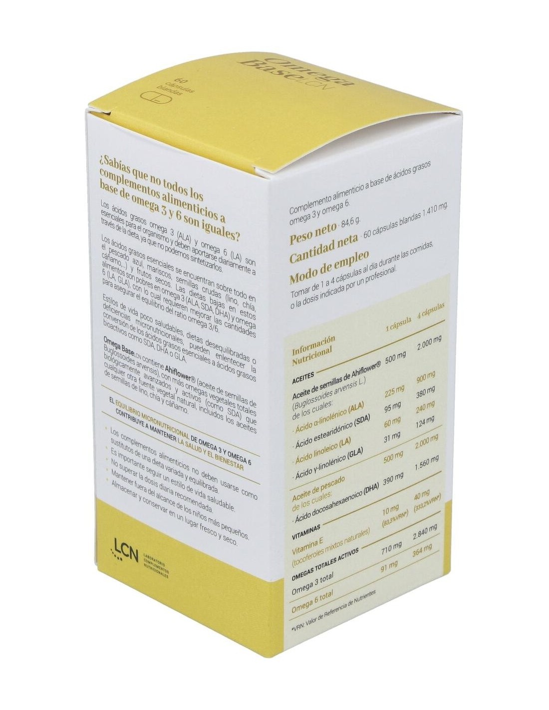 Cn Omega Base Lcn 60 Cápsulas es un complemento alimenticio formulado a base de ácidos grasos omega 3 y omega 6, aceite de chía virgen, aceite de pescado, aceite de onagra vírgen y tocoferoles mixtos naturales como fuente de vitamina E.