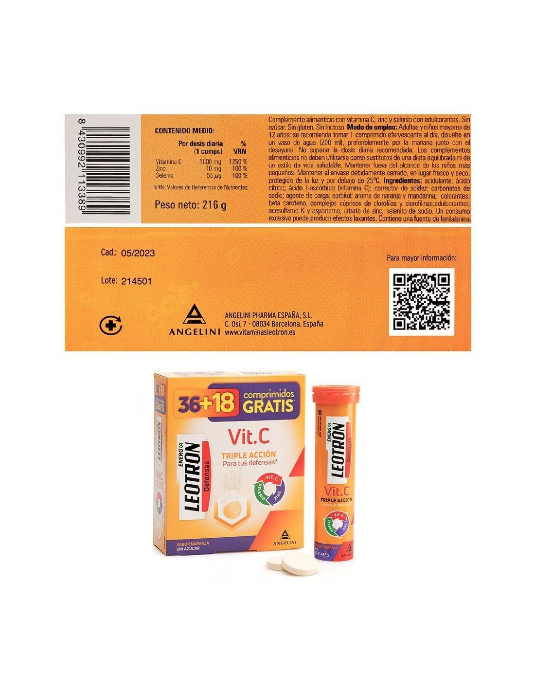Complemento alimenticio sabor a naranja que ayuda a reforzar las defensas y al sistema inmunitario. Contribuye a la protección de las células frente al daño oxidativo. Mejora la absorción del hierro, ayuda a regenerar la forma reducida de la vitamina E y contribuye a la formación normal de colágeno para el funcionamiento normal de los huesos, cartílagos, encías, piel y dientes. Compuesto a base de Vitamina C, selenio, zinc, entre otros. No contiene azúcares, gluten ni lactosa. Formato de 36 cápsulas más 18 de regalo.