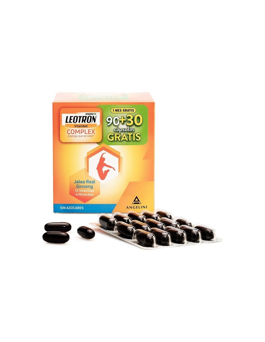 LEOTRONComplemento alimenticio con Jalea real, Ginseng, 12 Vitaminas y 4 Minerales. Las vitaminas B2, B5, B6, B12, C y el magnesio ayudan a disminuir el cansancio y la fatiga. La vitamina B5 contribuye al rendimiento intelectual normal y el zinc y el yodo a la función cognitiva normal. Las vitaminas B6, B12, D, A, C y el zinc ayudan al funcionamiento normal del sistema inmunitario. Para adultos y niños a partir de 12 años.