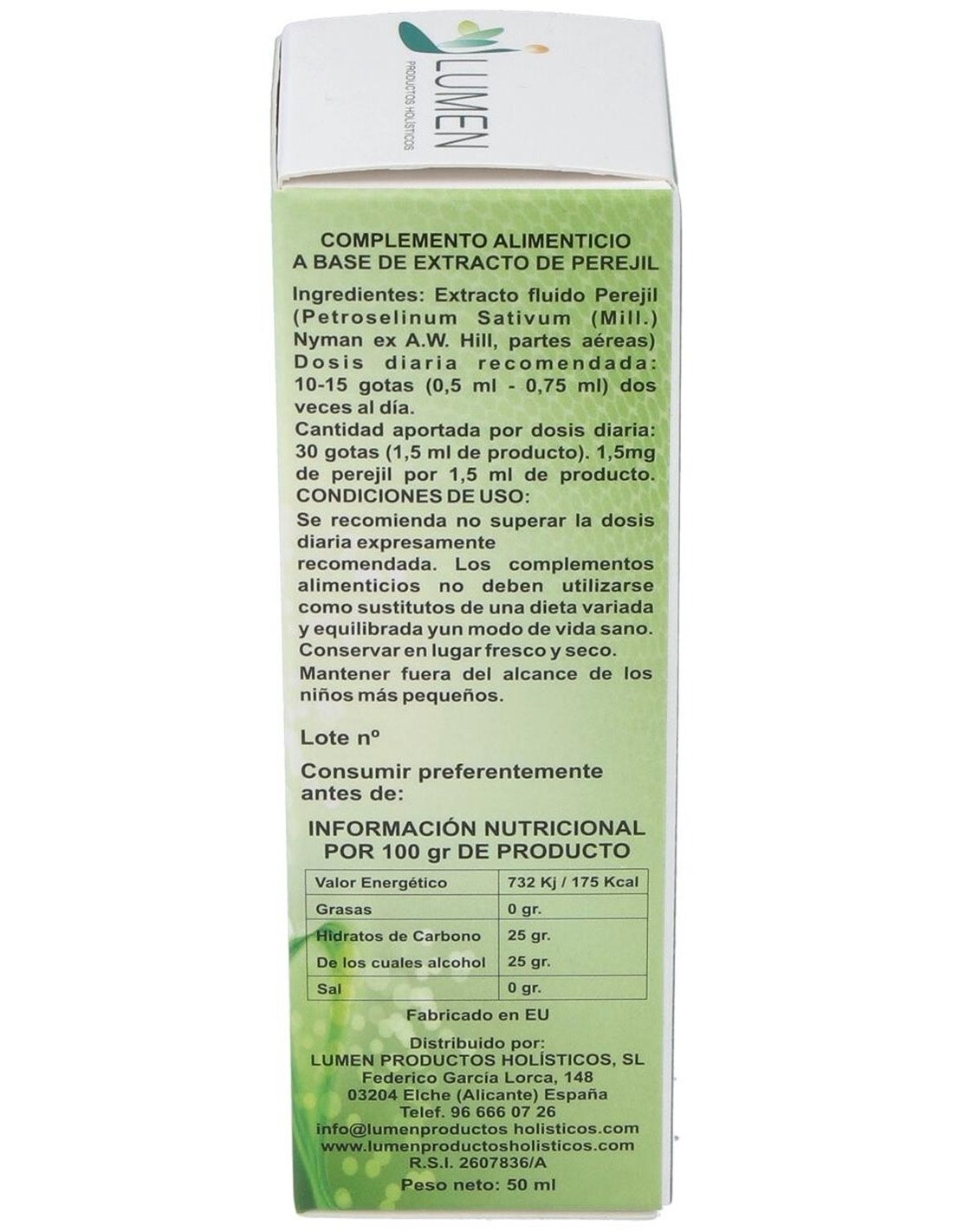 Extracto de Perejil de Lumen. Producto extraído de la planta de perejil, proporciona propiedades que contribuyen a reducir la fatiga, cansancio, entre otros. Además, ayuda a la pérdida de peso y eliminación de líquidos de forma natural. Contiene vitaminas C, K, calcio y hierro (dos veces más que en las espinacas). La composición es rica en clorofila: la cual combate el mal aliento y ayuda a limpiar el organismo de toxinas y exceso de grasa.